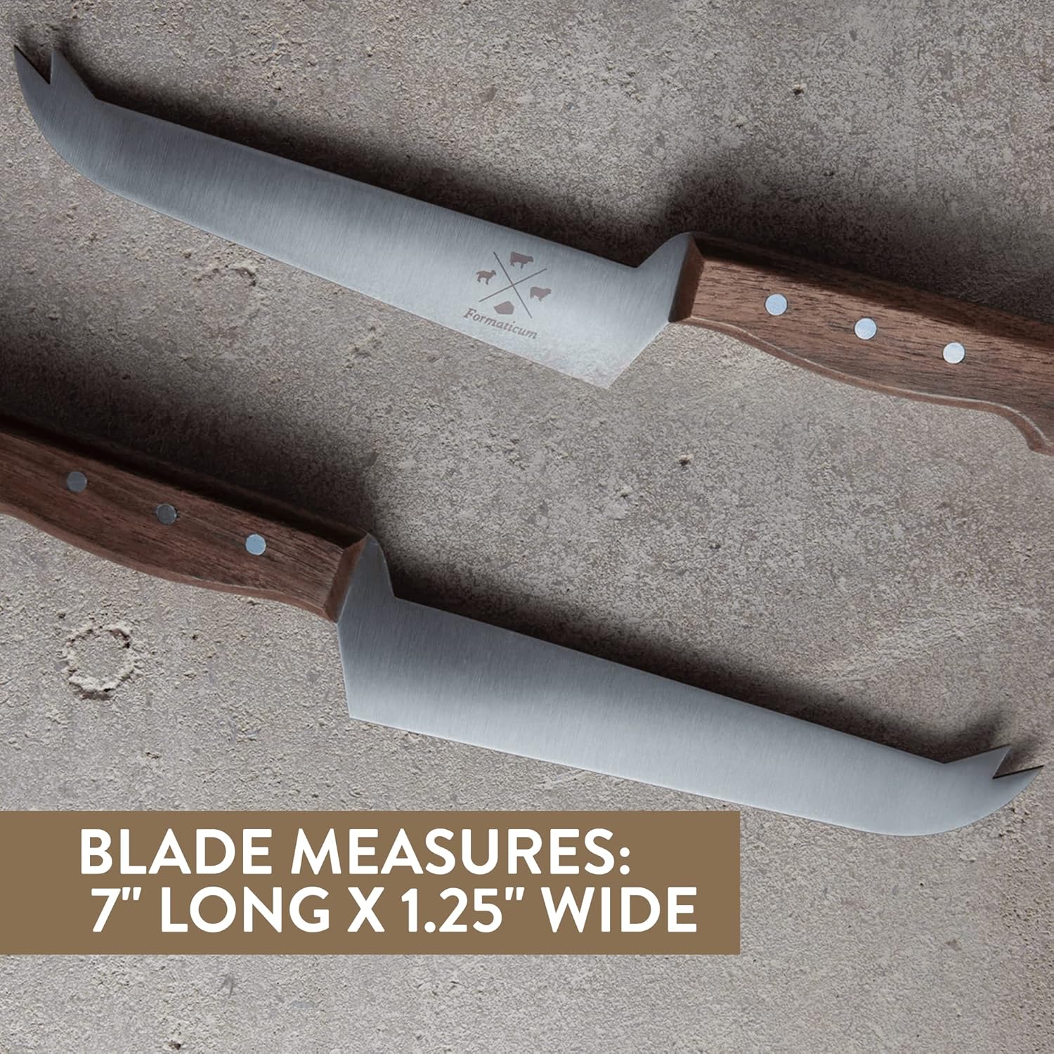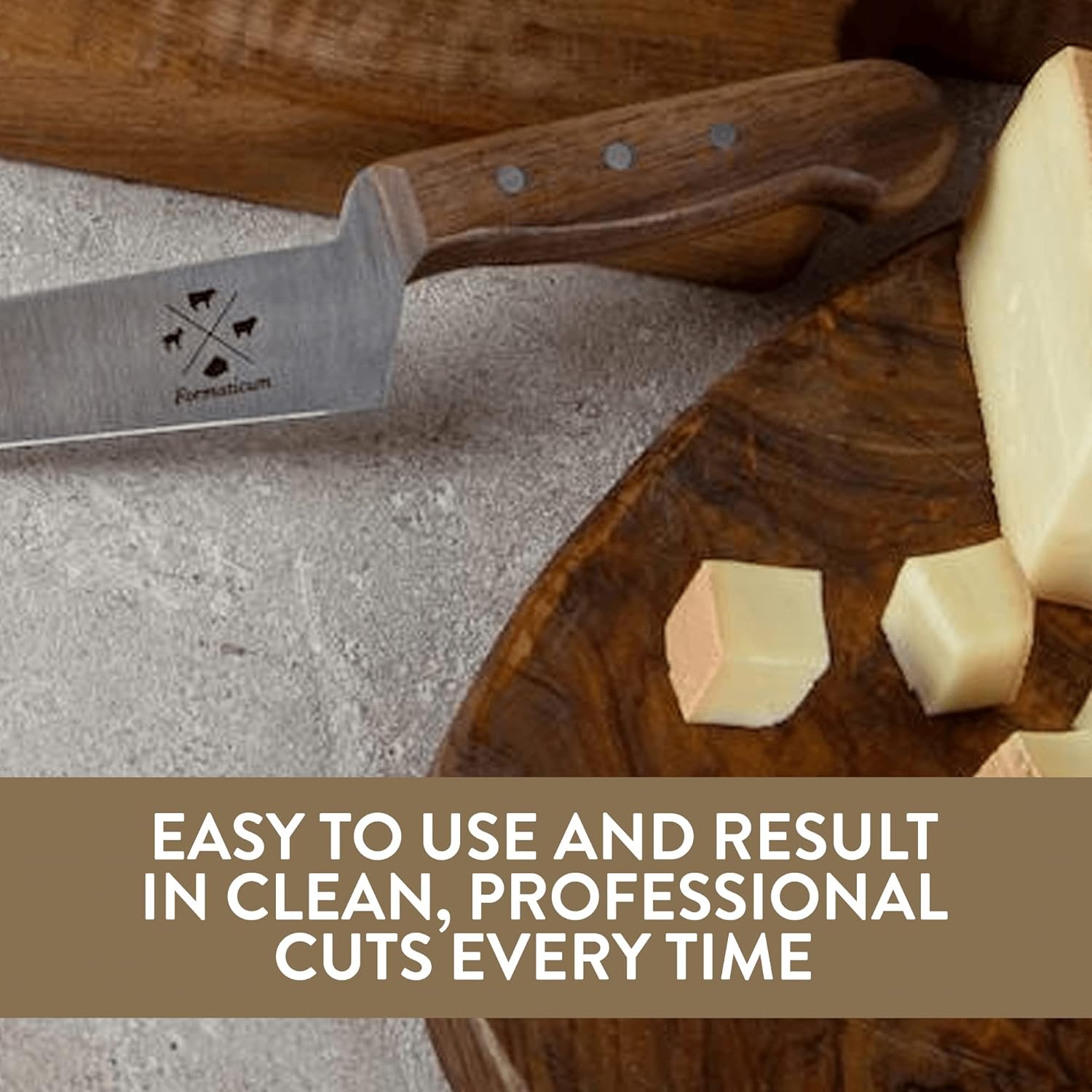 - STAINLESS STEEL BLADE: Formaticum's professional cheese knife features a durable and rust-resistant 7" x 1.25" stainless steel blade, making it easy to share bits with friends. This expertly designed cheese slicer effortlessly cuts all types of cheese and features a tasting fork at the tip, making it an essential tool for your charcuterie board.