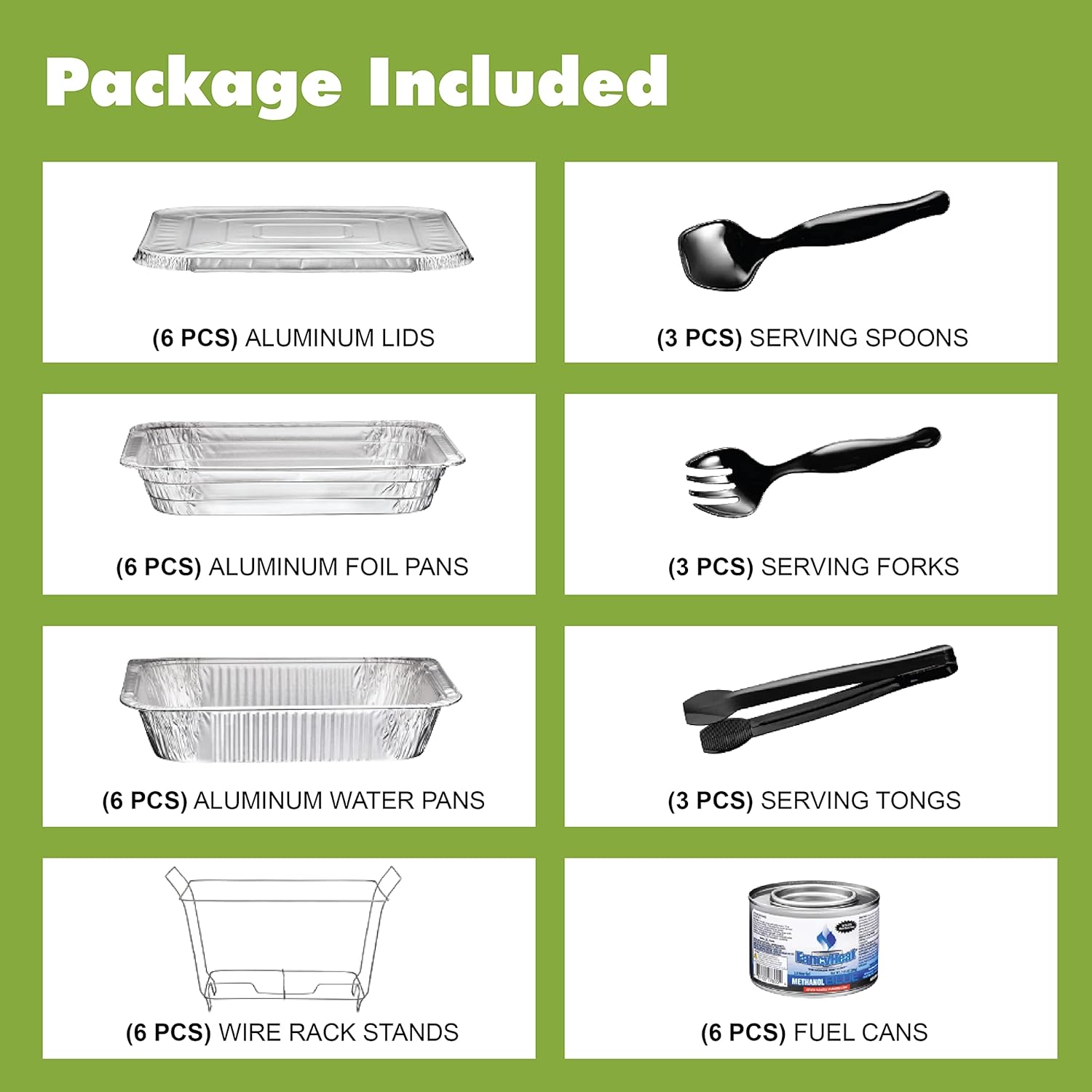 - 9x13 COMPLETE CHAFING SET FOR YOU: Get everything you need for your party food warmer with our chafing dish buffet set disposable. This catering set includes 39 clean, damage-free pieces: 6 half-size chafing dish wire racks, 6 half-size aluminum water pans, 6 half-size food pans, 6 foil lids, 9 serving utensils (3 forks, 3 spoons, 3 tongs), 6 gel cans (each gel can lasts up to 2.5 hours).