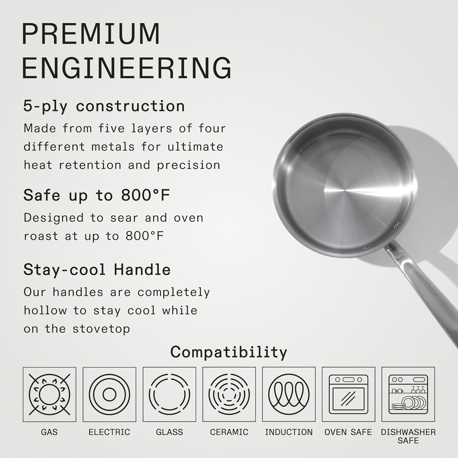 - Induction Cooktop Compatible - With a top layer of 430 stainless steel this Stainless Clad Pots and Pans work with any cooktop, including induction