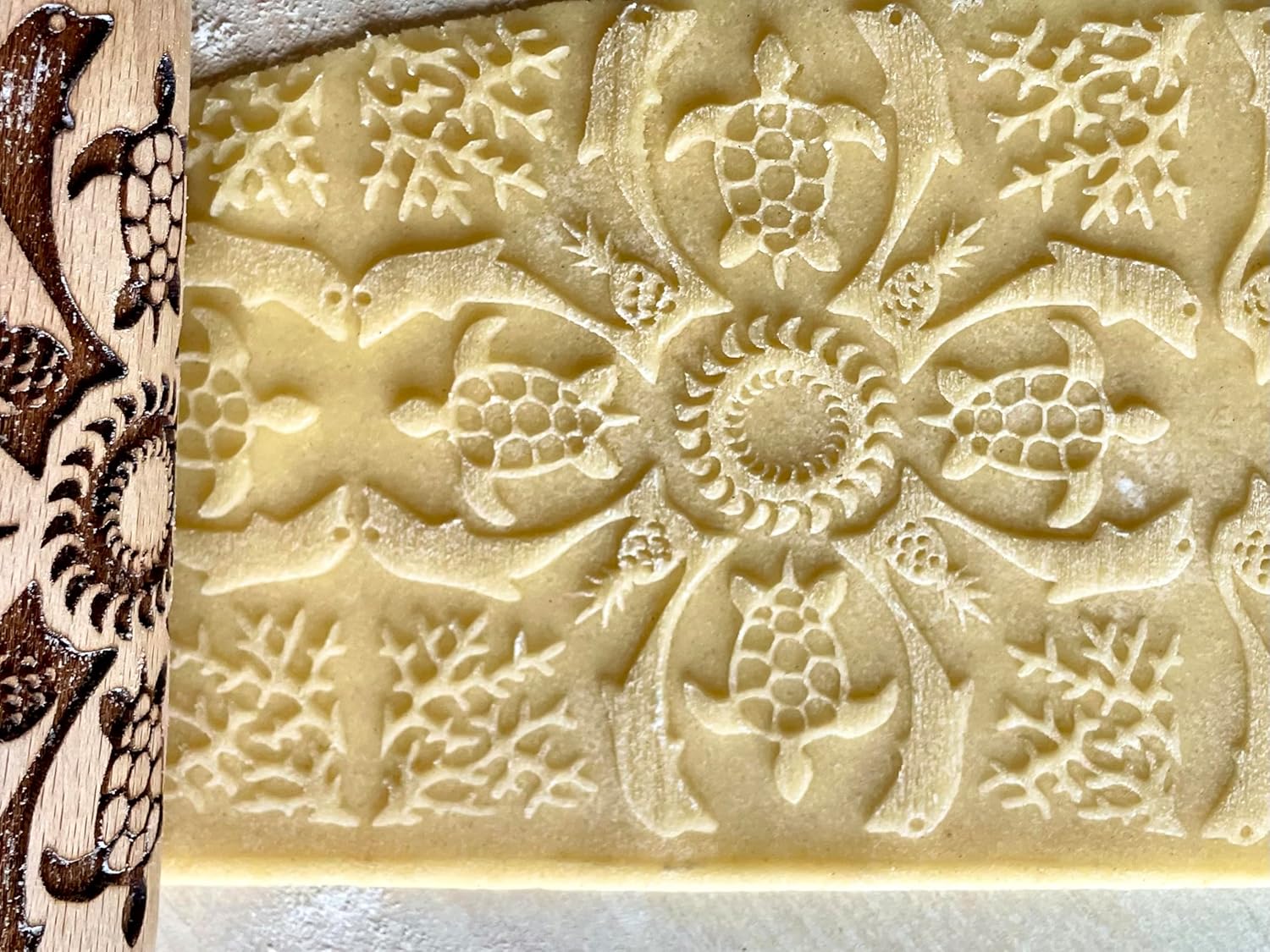 - COMFORTABLE DESIGN - This rolling pin with pattern is made with ergonomics in mind so that anyone can use its mesmerising designs! Rolling pin measures are approximately 9.5" (24 cm) from handle to handle, embossing part 4,5 inches (11 cm), diameter 2" (5 cm), made of beech wood. The finished product is food safe.