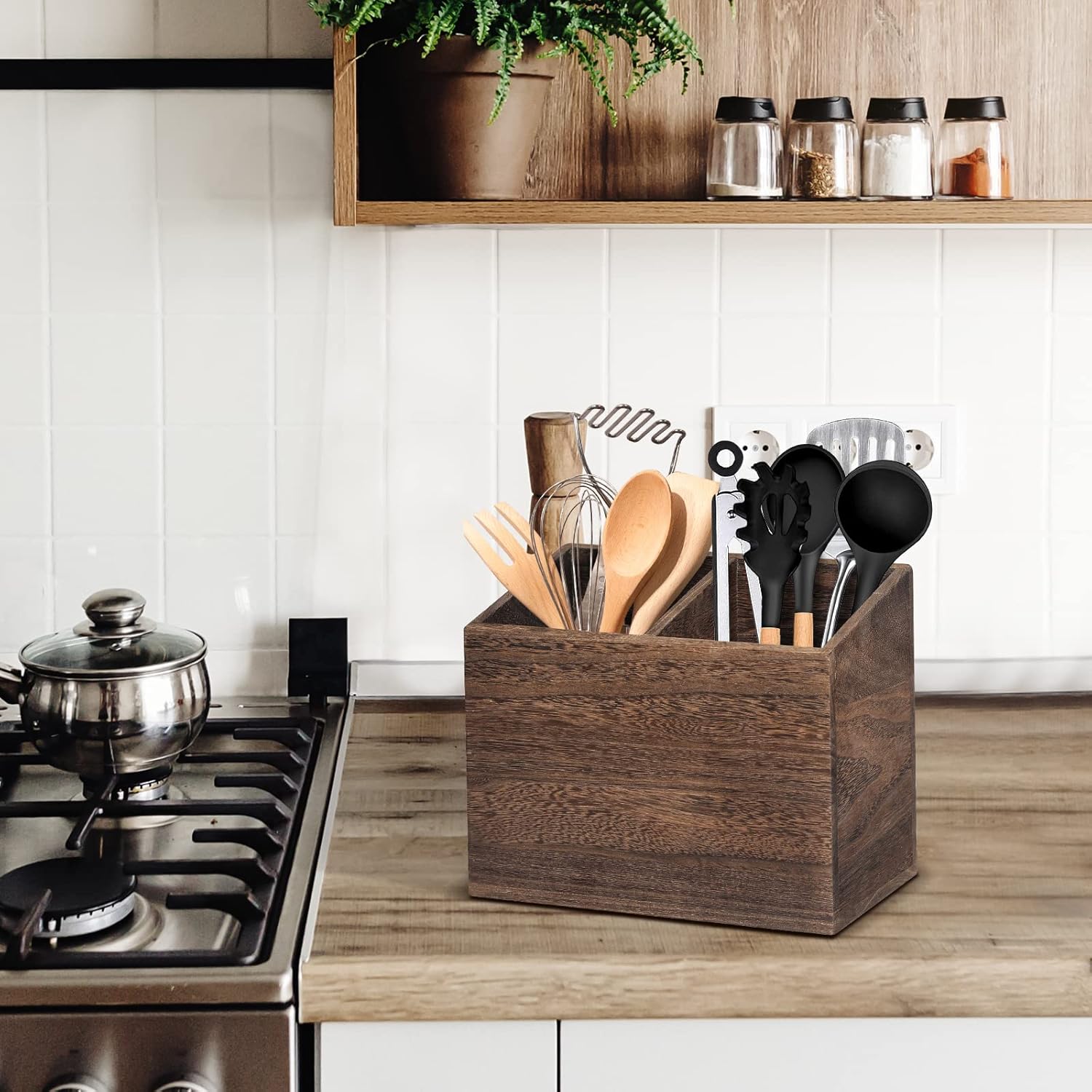 Wooden Kitchen Utensil Caddy With 2 Compartments, Rustic Utensil Holder for Kitchen Countertop, Wood Utensil Crock Organizer Box for Farmhouse Kitchen Decor (brown)