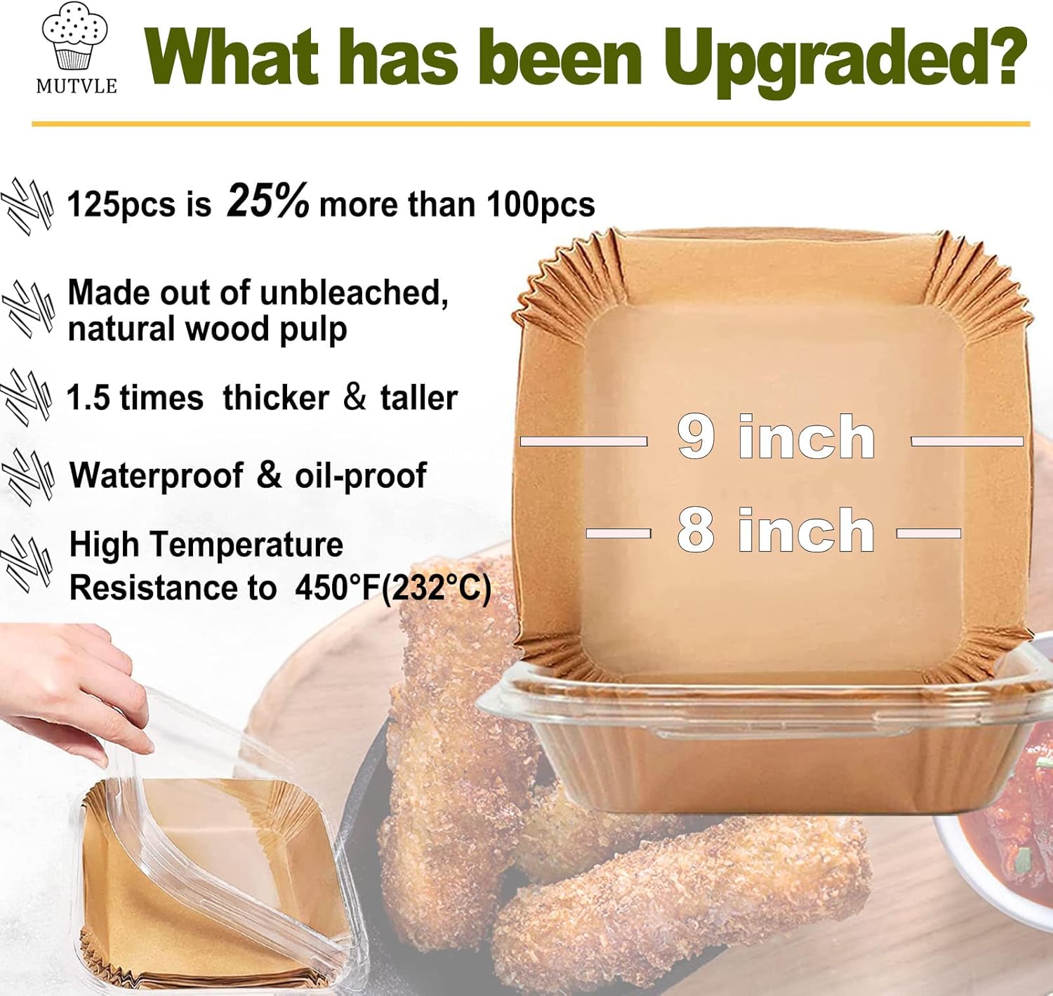 - 【Info】Large Size. 125 PCS. Square shape. Wide 9 inch, bottom wide 8 inch, high 1.8 inches, perfects for 5-8 quart air fryer. PLEASE MEASURE YOUR AIR FRYER BASKET BOTTOM BEFORE PURCHASE!