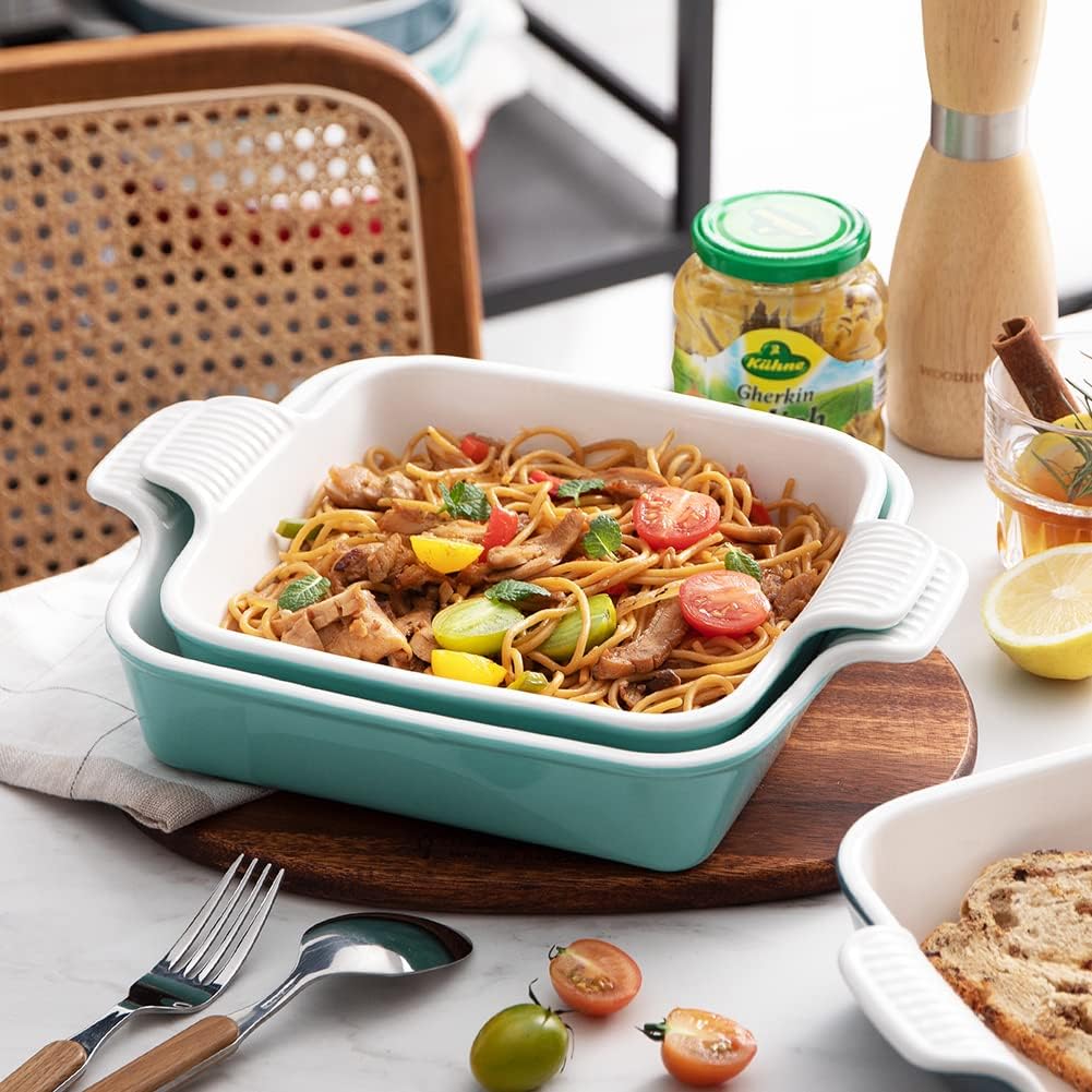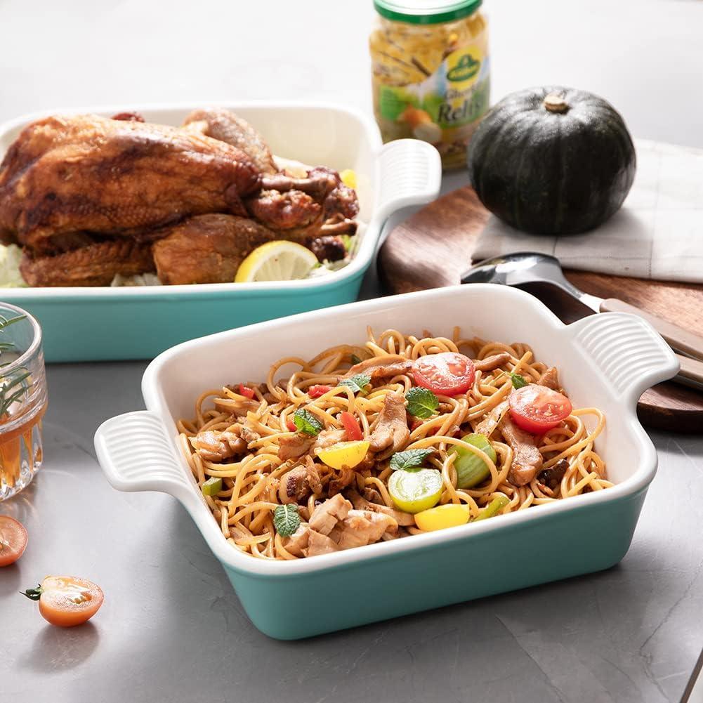 Sweejar Ceramic Baking Dish, 8 x 8 Cake Baking Pan for Brownie, Porcelain Square Bakeware with Double Handle for Casserole, Lasagna, Family Dinner (Dark Turquoise)