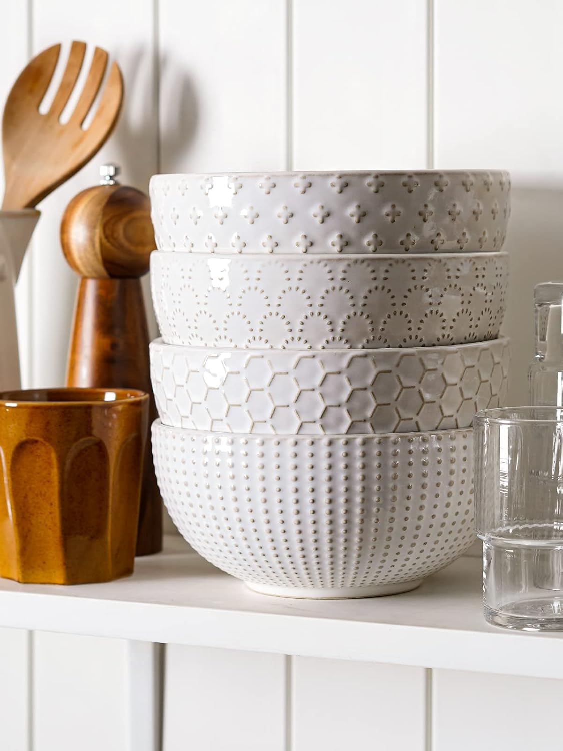 - House Warming Present Idea: Each bowl has a different pattern embossment. The outside of the bowl is embossment. The inner glaze is a smooth ceramic surface. New homeowners will like the timeless farmhouse look of these bowls
