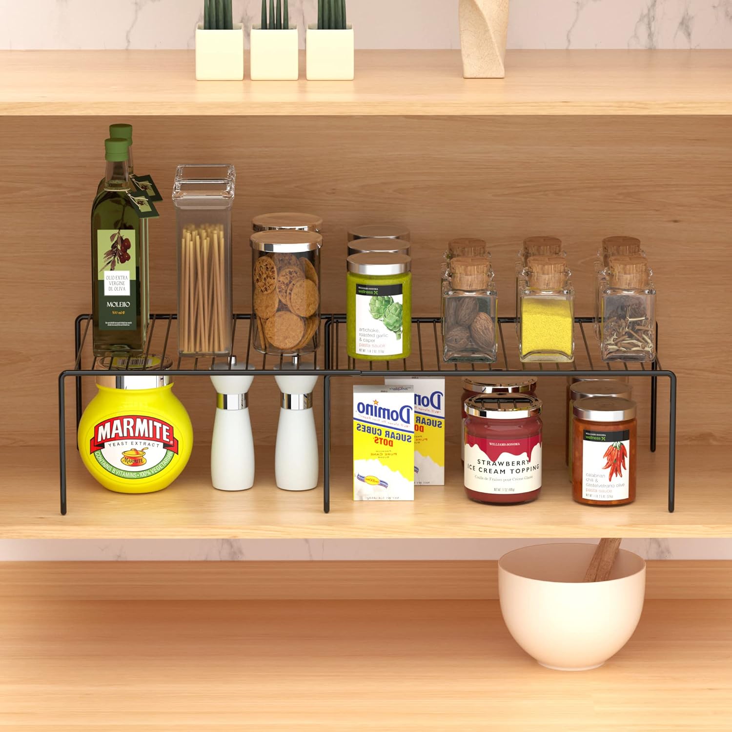- FUNCTIONAL STORAGE:Perfect shelf to keep everything organized in cabinet, pantry, cupboard, closet, drawer or counter top in kitchen, bathroom, bedroom and under the sink. With the mesh design board, it can be a drying rack for dishes, bottles, plates.