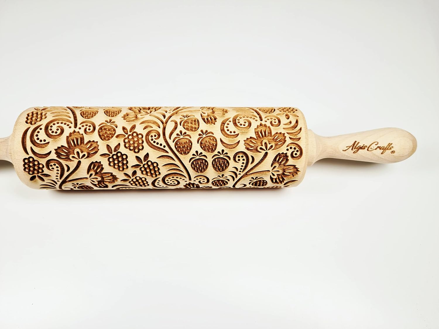 - Constructed out of highly durable Beech wood, this laser-etched rolling pin is optimally sized to roll out dough, with a large 7.9" embossing surface, 2.4" diameter, and 15.8" overall length (with handles).