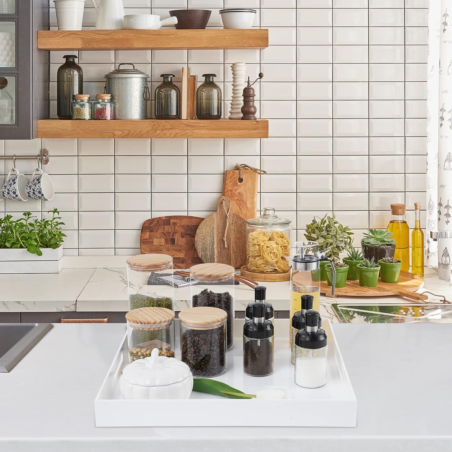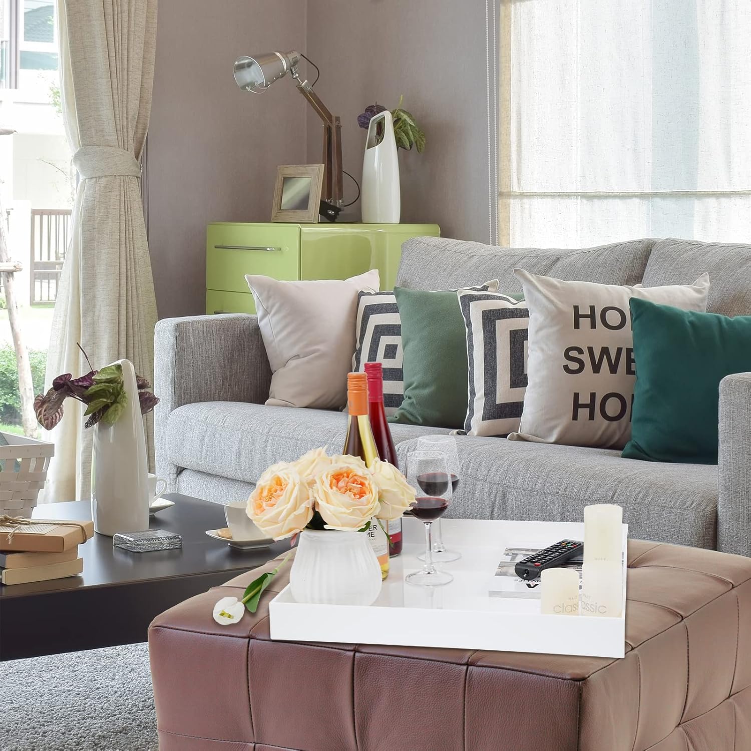 - Material: Our serving trays with handles are made of glossy white acrylic, Which is high quality and sturdy, The acrylic is a environment friendly material, Our square extra large acrylic trays are perfect ottoman trays for living room