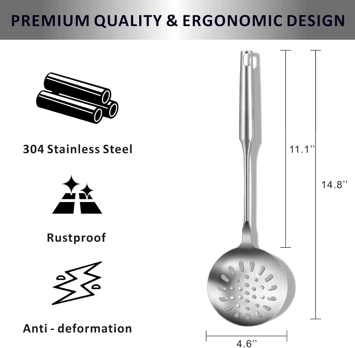 - HIGH QUALITY SAFE MATERIAL - The Turner and the handle of the slotted spoon is made by integral forming of 304 stainless steel, more durable and safe. It is rustproof, durable and will last long. No longer to worry about loose handles.