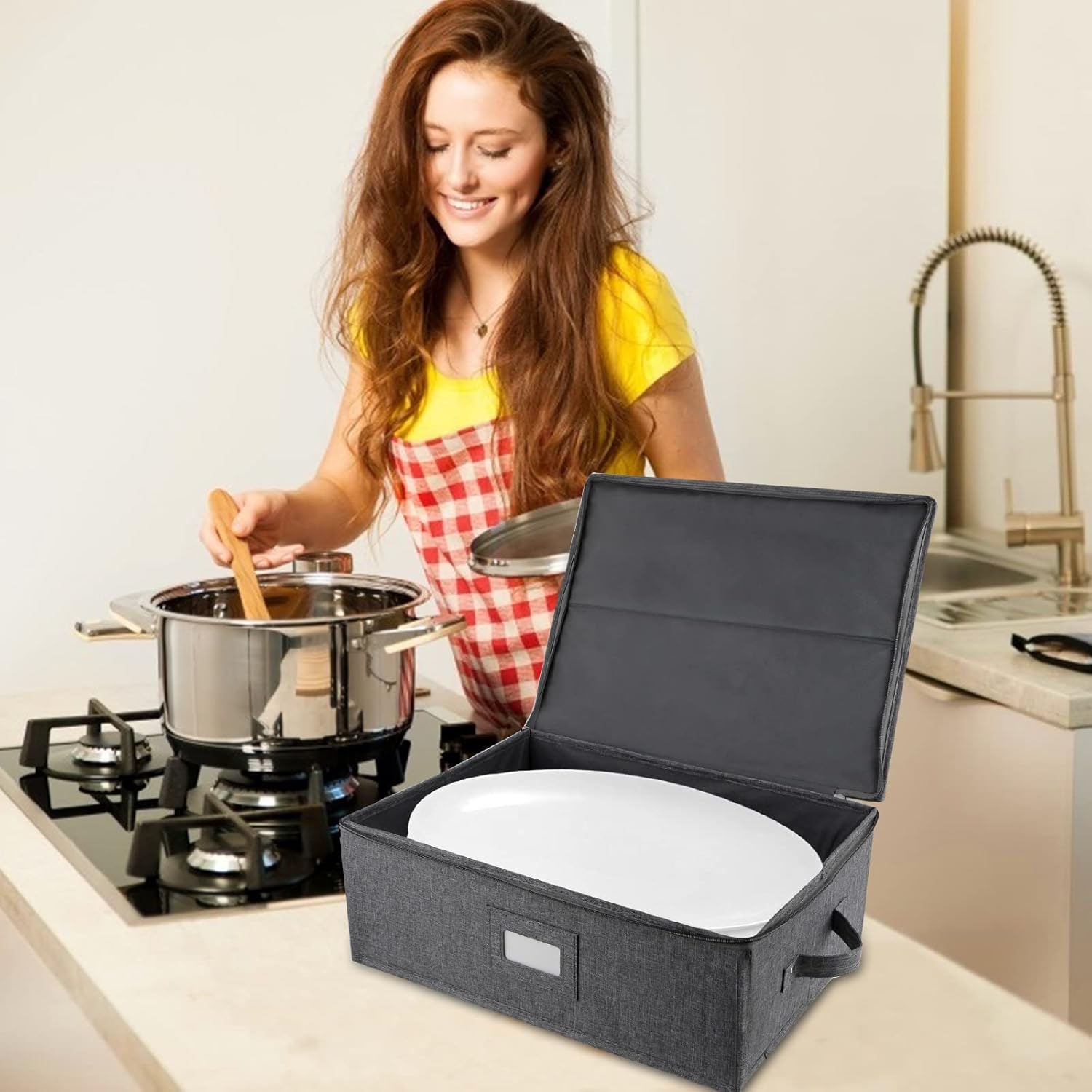 - STACKABLE CHINA STORAGE CONTAINERS - The platter storage case has a sturdy top, bottom and side. It is 17" x 13" x 6". Added protection when storing, transporting or moving you china dishes. It includes a label holder to easily identify contents