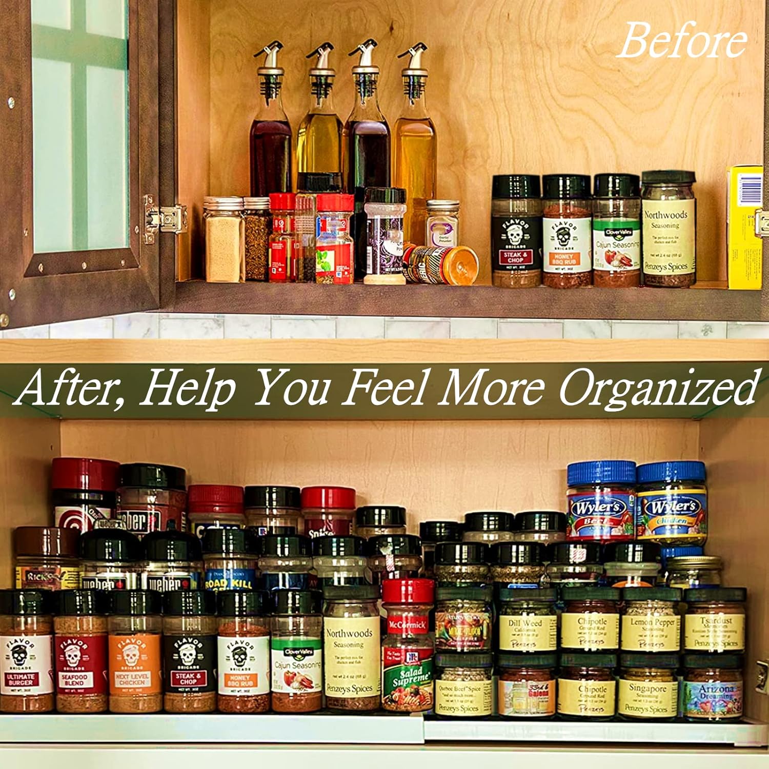 - Stepped Design - Our spice organizer has a stepped design to make it easier to find the herbs and seasonings.his tier spice rack can be used not only to store spices but also to organize and declutter your bedside drawer, your bathroom cabinet, your work desk, and even your other kitchen cabinets.