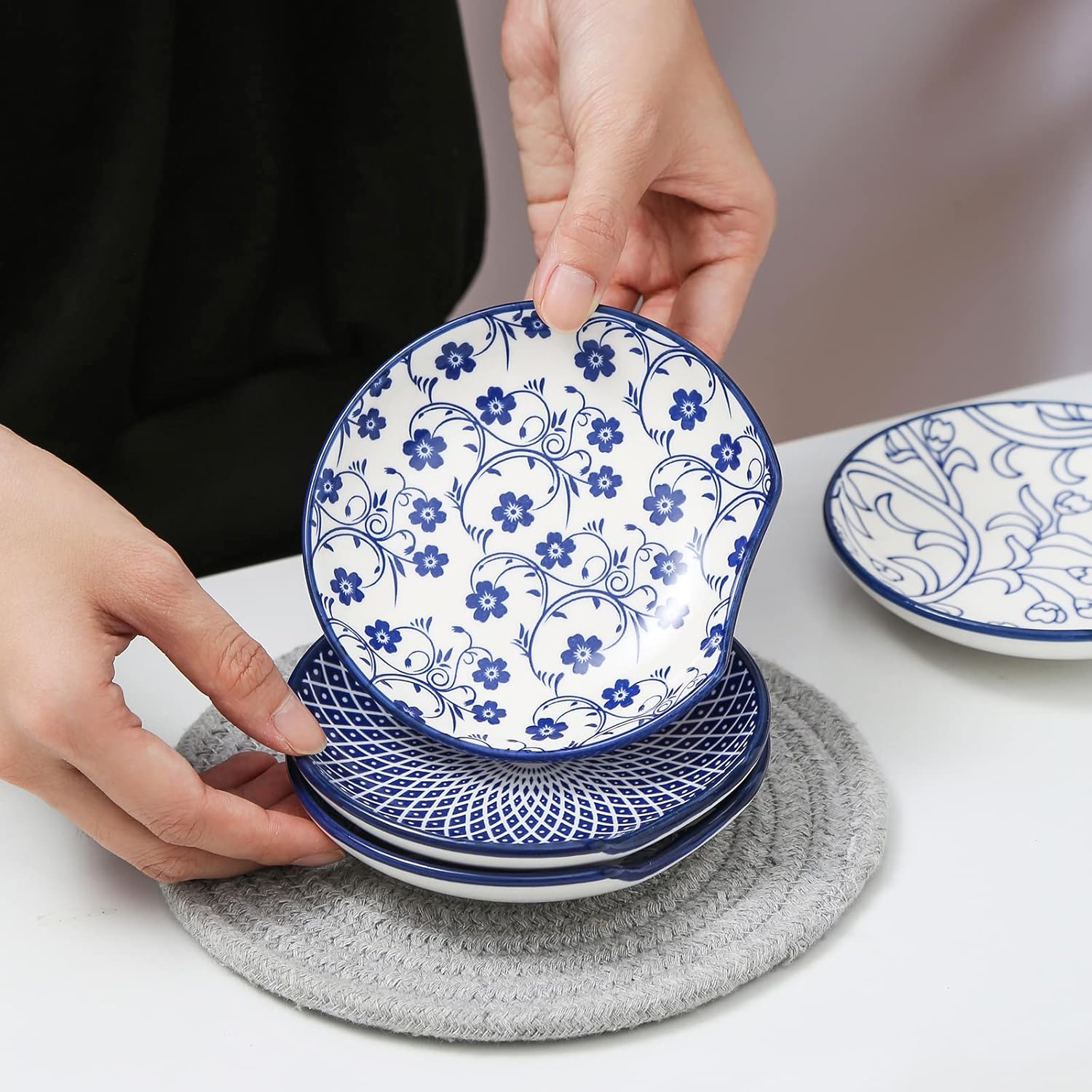 Selamica Ceramic Spoon Rest for Stove Top, 4.6 Inch Cooking Spoon Holder for Kitchen Counter, Stackable Utensil Rest Holder for Spatula Ladles Tong, Set of 4, Vintage Blue