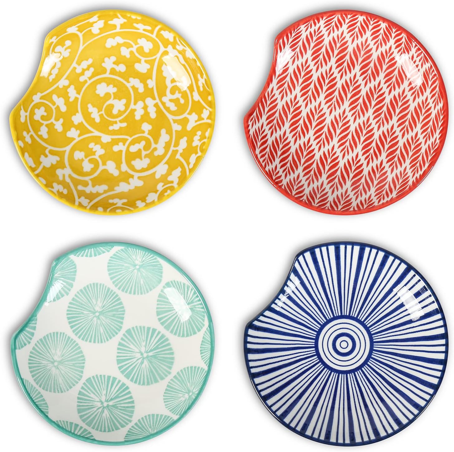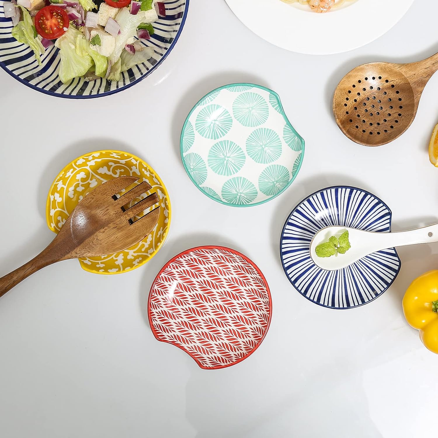 - PRACTICAL & DELICATE DESIGN - Each coffee spoon holder featured a circular depression design to keep the utensils in place. The slightly raised edge reduces the contact area with the table and collects all the water dripping from your cookware better. The assorted patterns decorated with vibrant colors can easily enlighten your dining table!