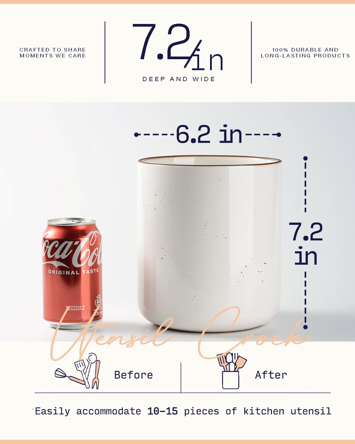 - [Large Utensil Holder] With a 6.2” width and 7.2” height hence enough space for storage, 10 to 15 pieces of common utensils can easily go into it, make utensils organized and easy to find, give you a neat and tidy kitchen
