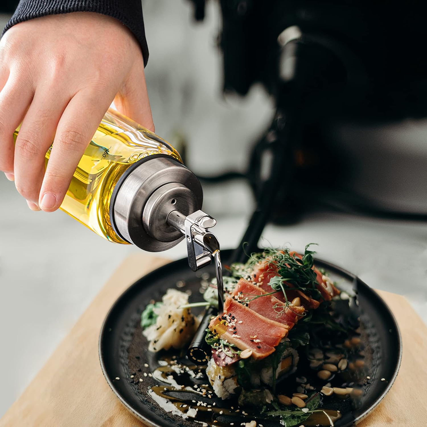 - 【Automatic Stainless Steel Lid】: The heavy metal spout automatically opens and closes with one hand, and the sealed lid keeps dust out. The anti-drip spout with clear ML scale makes pouring oil or vinegar easy and precise.