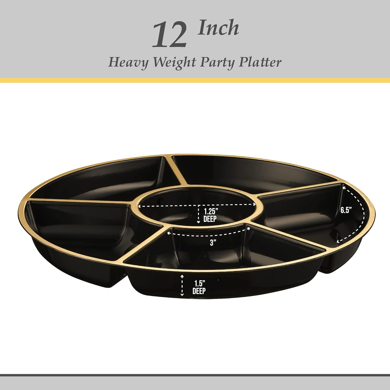 PLASTICPRO 6 Sectional Round Plastic Serving Tray/Platters Black & Gold Pack of 2