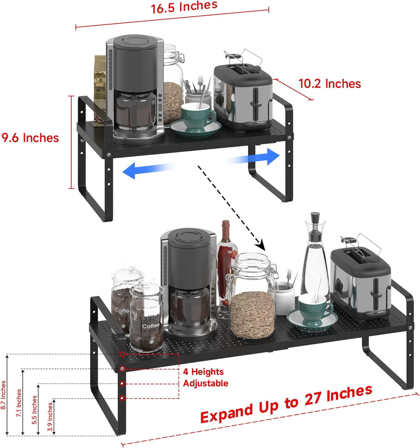 - Expandable &Stackable Cabinet Shelf Organizer: The width and height of the expandable kitchen cabinet shelves can be adjusted according to your needs, which is a very practical storage shelf. The dimensions before expansion are 16.5 "L x 10.2" W x 9.6 "H. Its length can be extended from 16.5" to 27". You can also stack the 2pack shelves together to form a two-layer storage space. Or it can be used as 2 single shelves separately