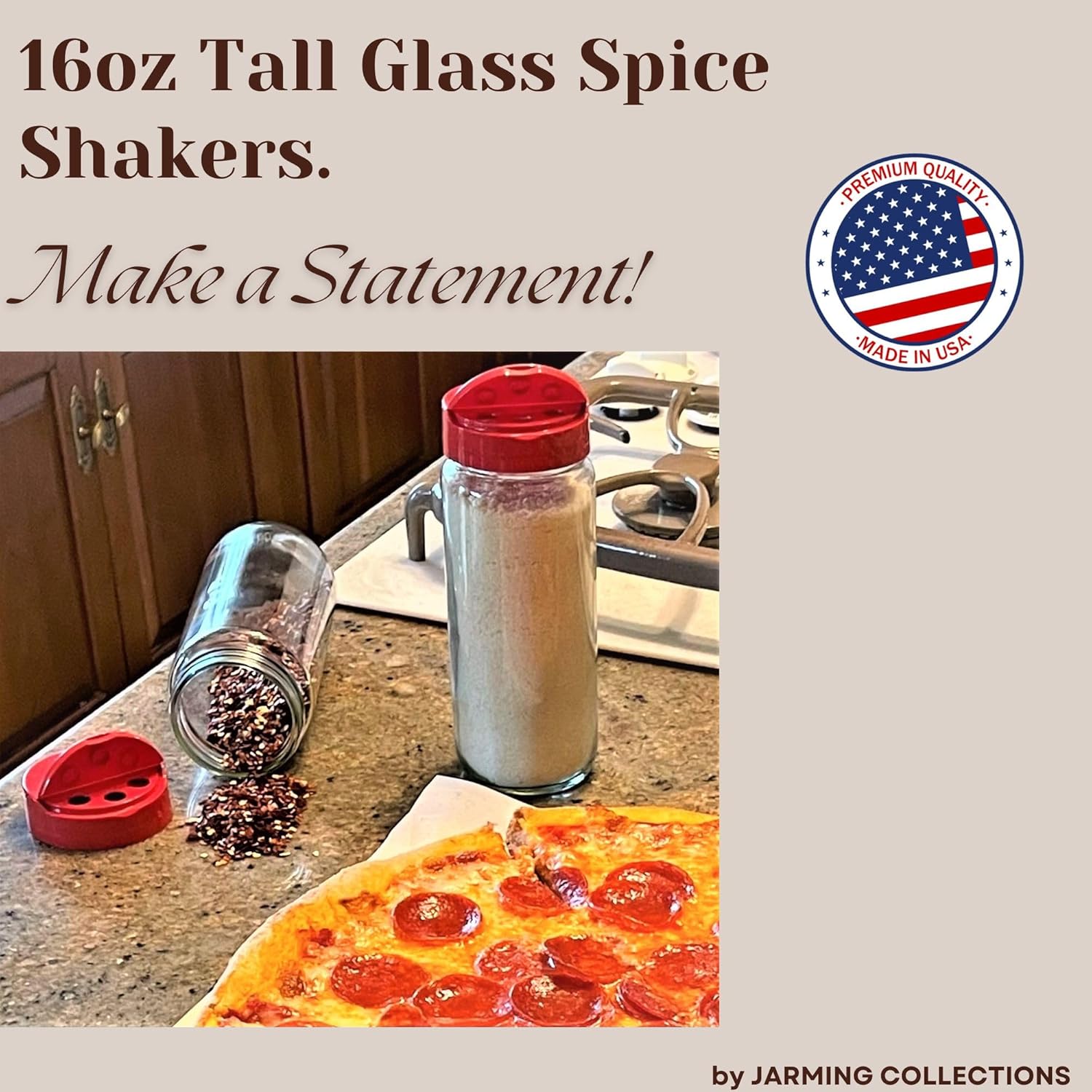 JARMING COLLECTIONS Premium Glass Spice Shakers - 16 oz Versatile Seasoning and Spice Dispenser with Sifting Lids for Popcorn, Cheese, Cinnamon, and Salt, Made in USA