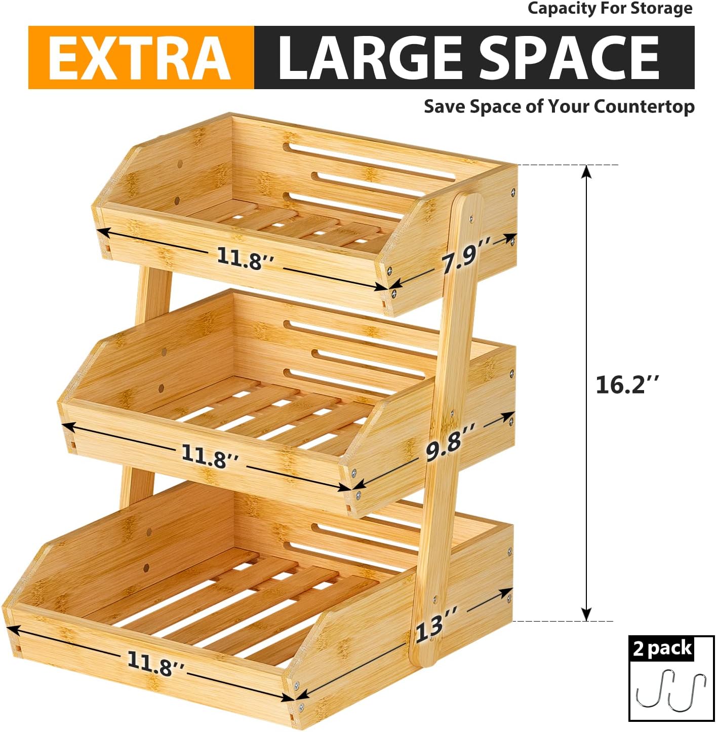- LARGE CAPACITY: Gmtsl fruit basket for kitchen counter used as large wooden fruit bowl with 2 banana hooks, you can put fresh fruit,Bread,Snack in each tier. Different sizes(2 or 3 tiers) meets different vegetable storage needs (each basket can be used separately)
