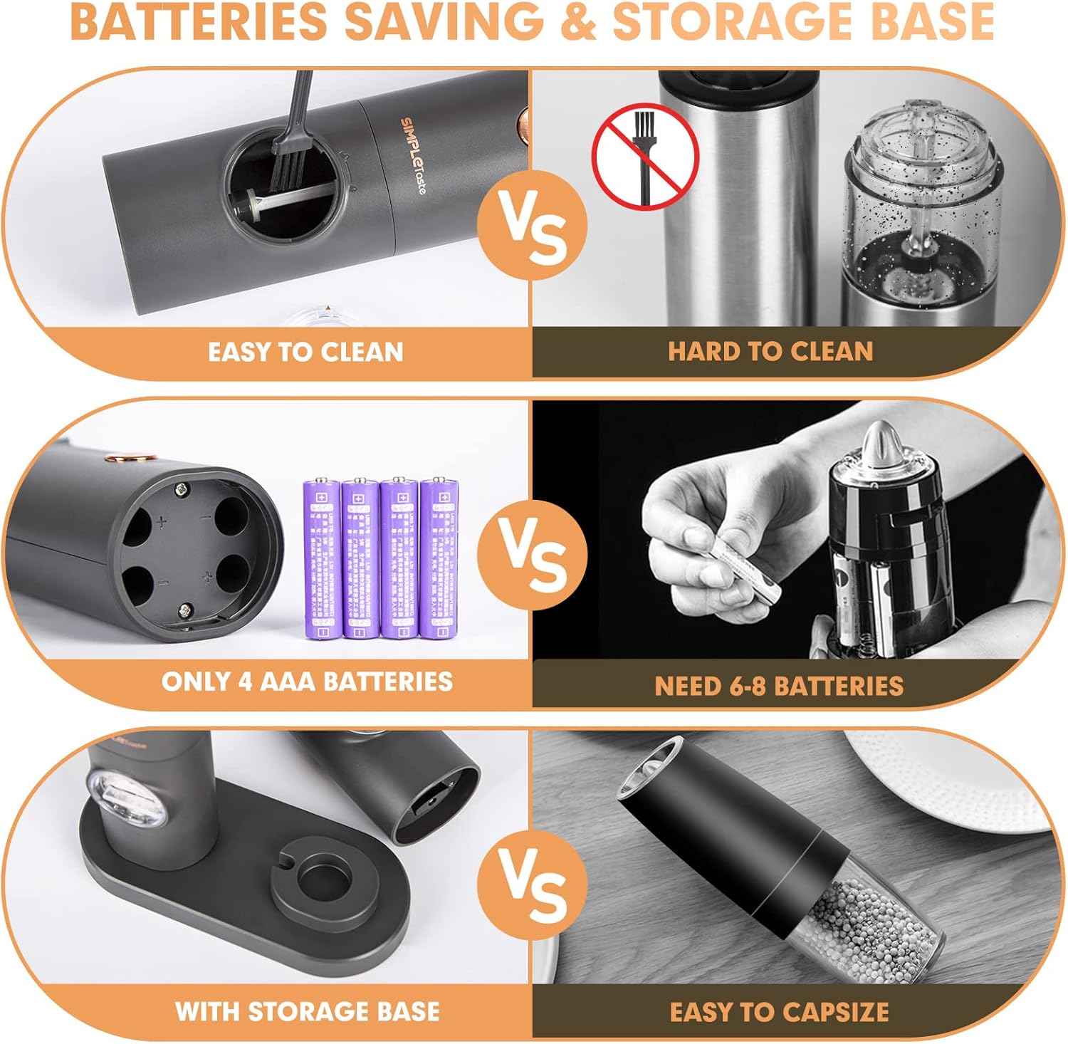 - Effortlessly Season Your Meals: With the one-handed operation of SIMPLETASTE electric salt and pepper grinder set, simply press the button to activate the automatic grinding of black, white pepper, food salt, Himalayan salt and so on