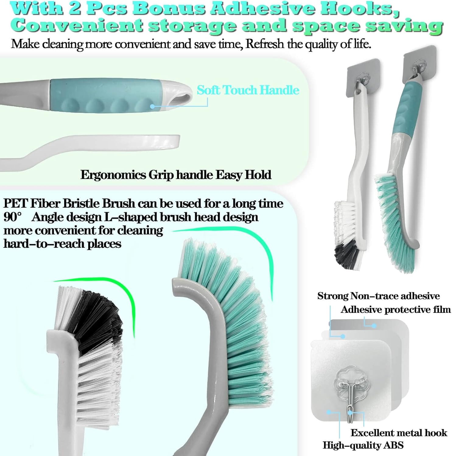 - 【User Friendly Design】Ergonomic Design-Comfortable handle. The Handles are made of High-quality plastic ABS and tough PP material, the brushes are made of premium PET fiber bristles, which are strong and durable without losing bristle. Easy to use, easy to store only hanging hold on adhesive hooks.