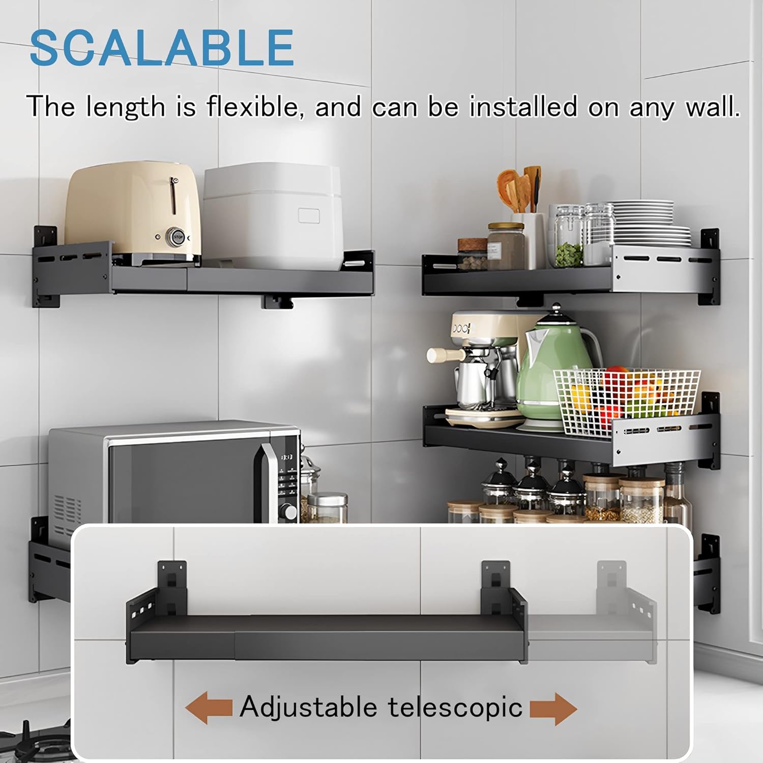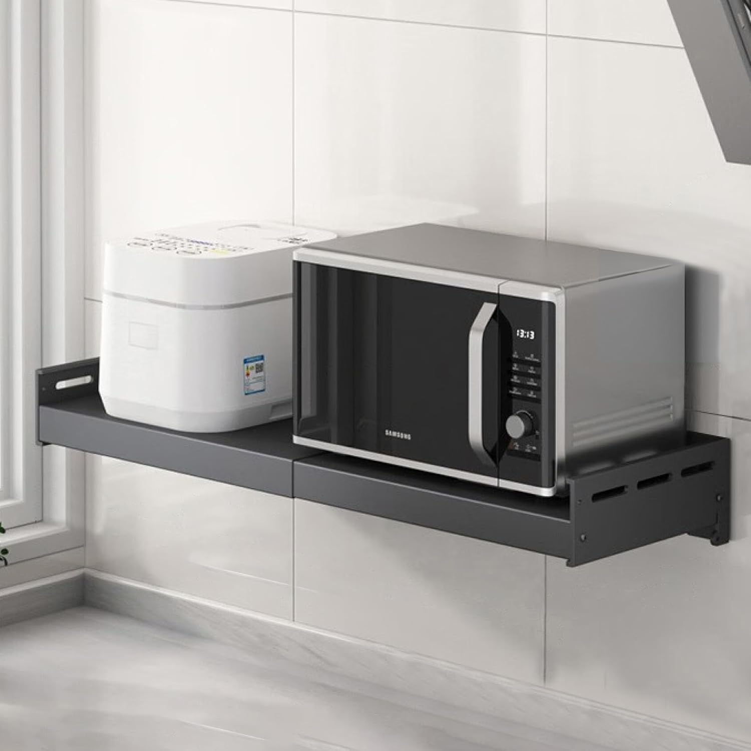 - Retractable and adjustable --- Place your microwave or electric oven on this wall-mounted stand, the length of which can be extended and mounted to suit your needs. You don't have to worry about the shelf being too long or too short. (Shelf: 16 inches wide, 16 inches before stretching, with a maximum load-bearing distance of 25.5 inches. Please do not exceed, as bending is prone to occur !!!!)