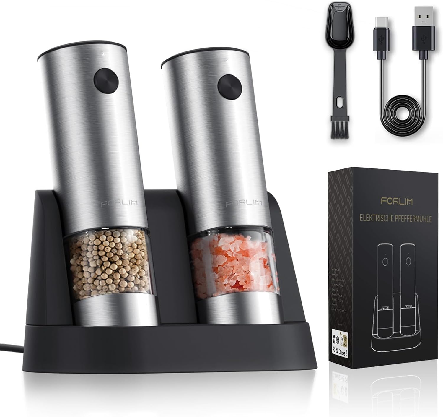 FORLIM Electric Salt and Pepper Grinder Set, USB Rechargeable Automatic Salt and Pepper Grinder Set with Upgraded Base, One Handed Operation Refillable Mill with Light, Adjustable Coarseness - 2 Mills
