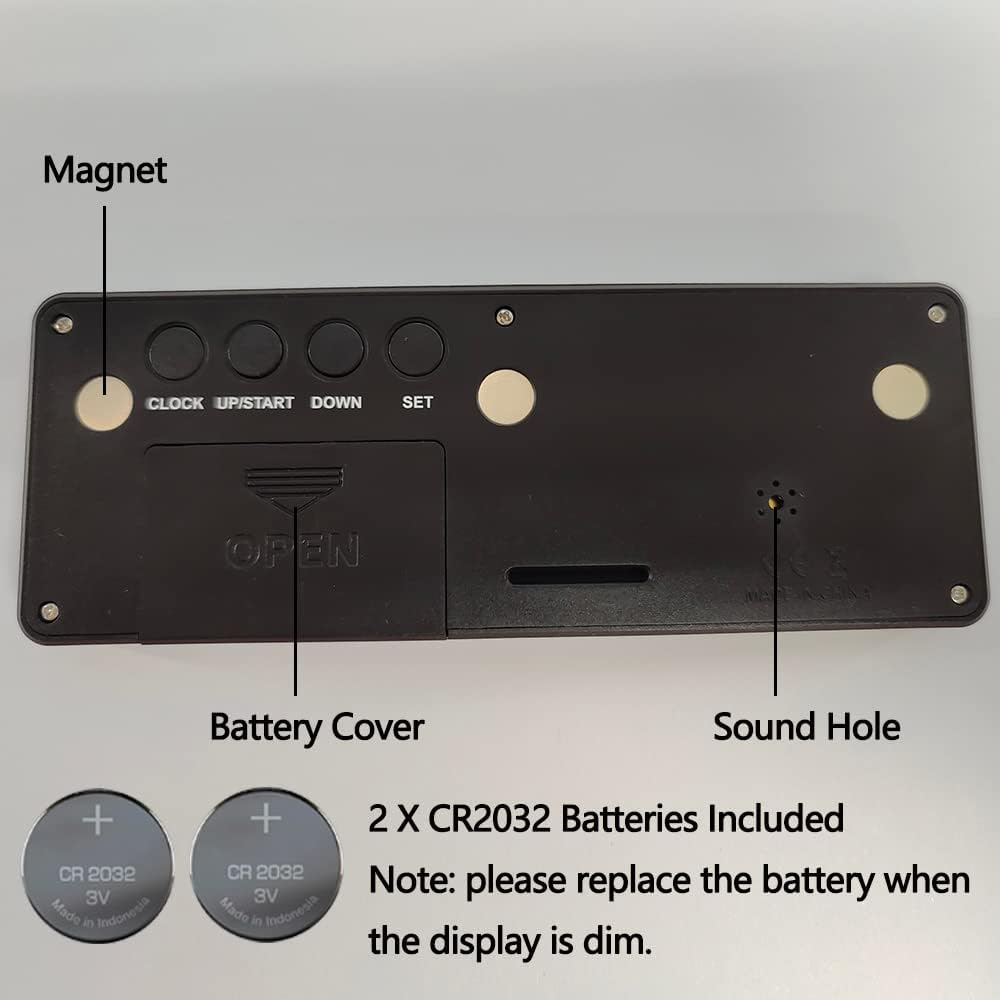 - ✔️EASY TO SET: Hold on the SET button to set the countdown timer and hold on the CLOCK button to set the clock. Two ways to place it. It has a little removable stand and 3 inset strong magnets at the back to stick on metal surface.