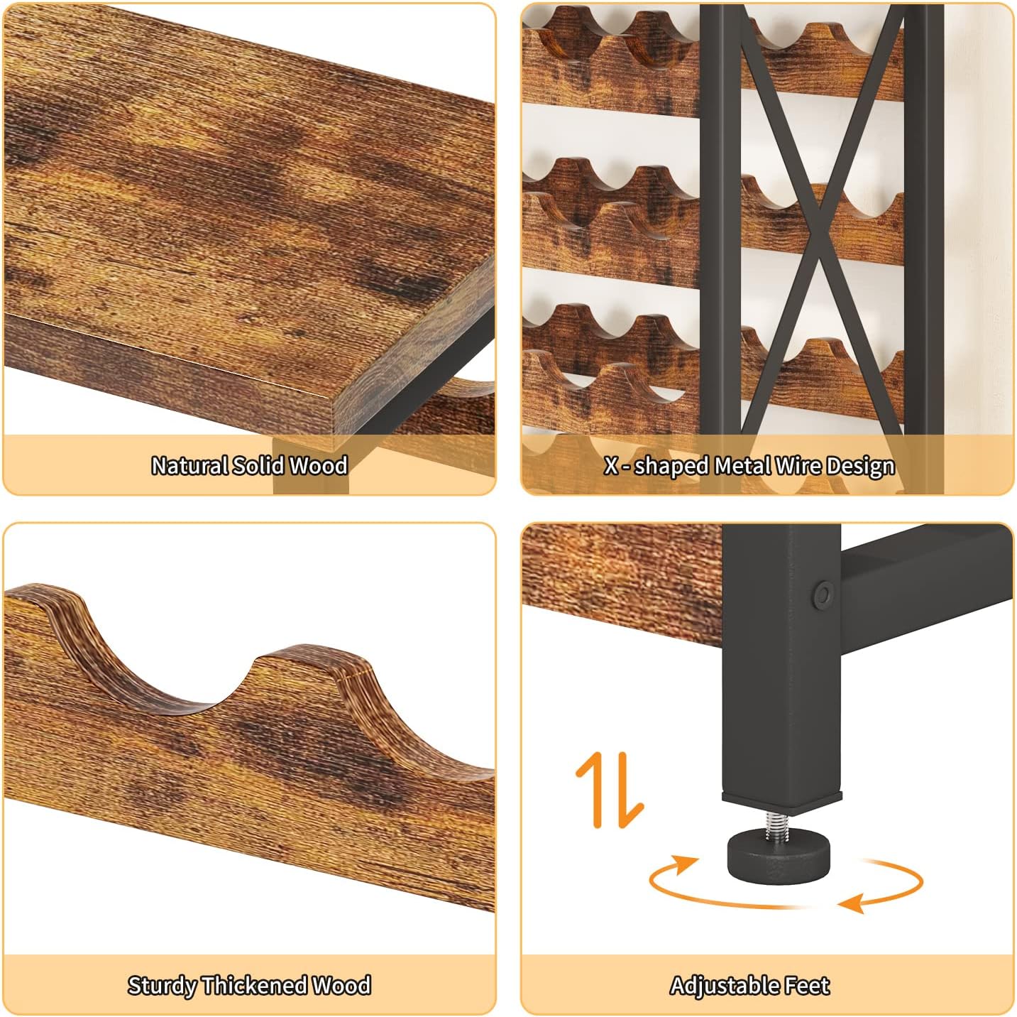 - 【Durable and Sturdy Construction 】Crafted from high-quality wood and metal, this wine rack offers both durability,aesthetics and stability. Its strong construction ensures that your wine bottles are kept safe and secure.