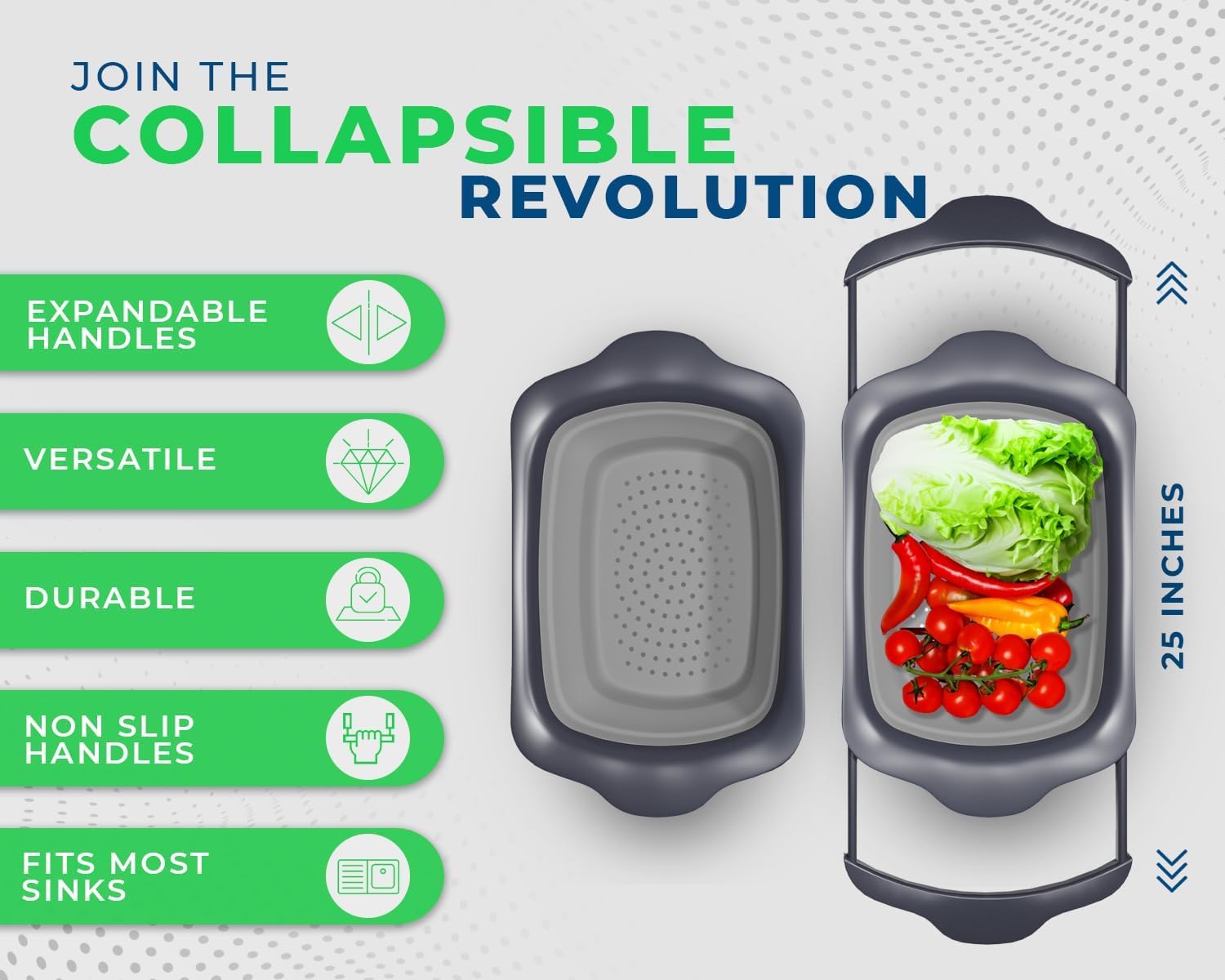- Large Enough, yet Foldable: The non-slip handles expand to almost 25", and the colander can hold up to 6 Quarts of your favorite food, but the space-saver design makes it easy to fold and store in your already cramped cupboard.