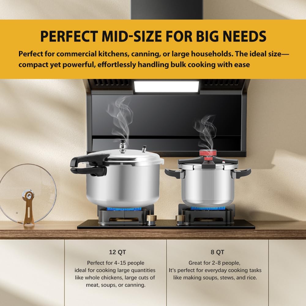 - [Superior Quality] Made of the aluminum-manganese-titanium alloy material,ensures this 12 quart pressure canner is highly rustproof and resistant to wear and tear. Extraordinary heat tranfer efficiency ensure the internal temperature increasing rapidly and saving your time on cooking foods