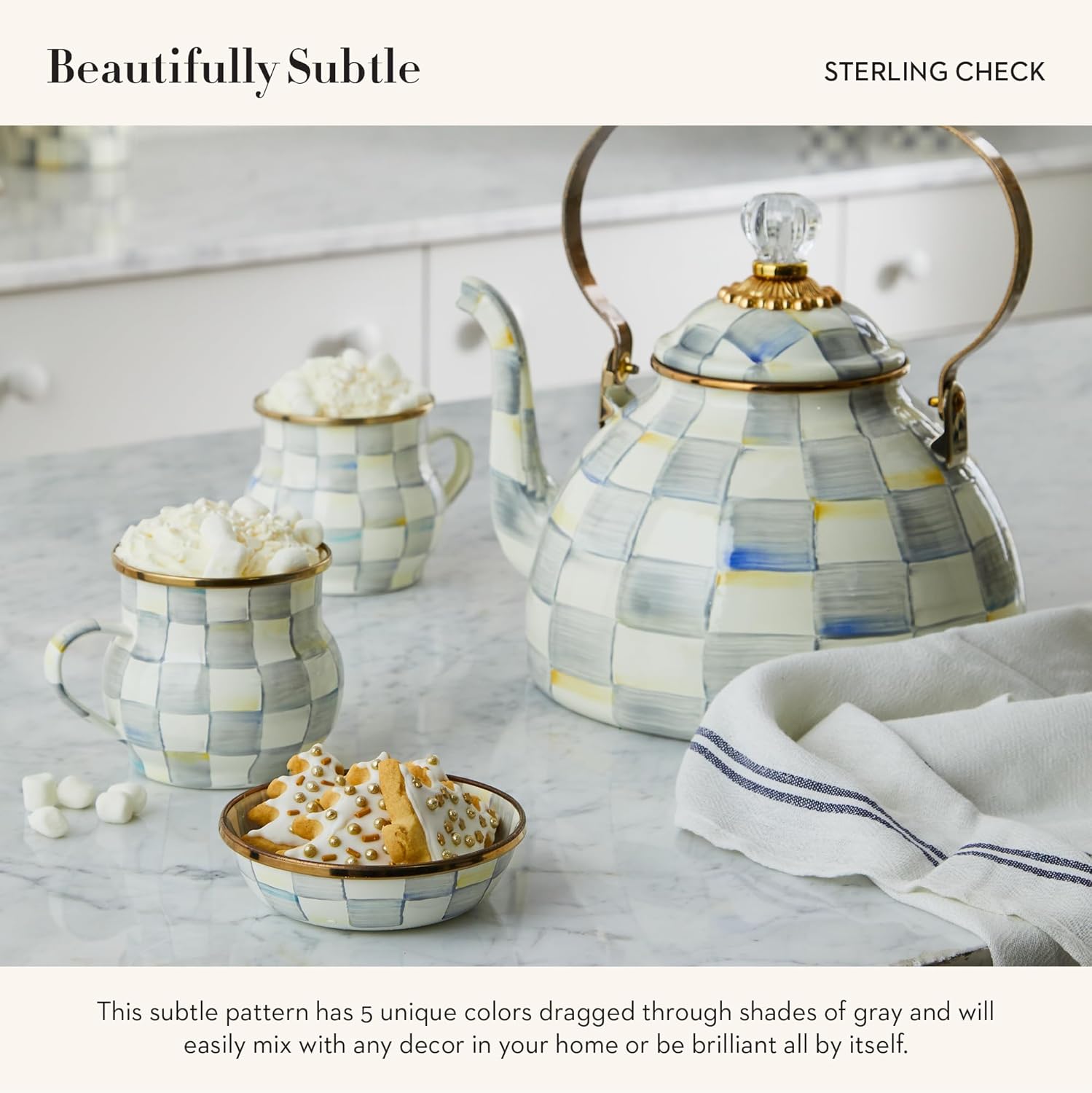 - ENTERTAINING ESSENTIAL: Accompany any dish with a tasty dip or sauce in this small bowl. It features our subtle Sterling Check pattern with hand-painted glossy, high-contrast gray-and-white checks on enameled steel.