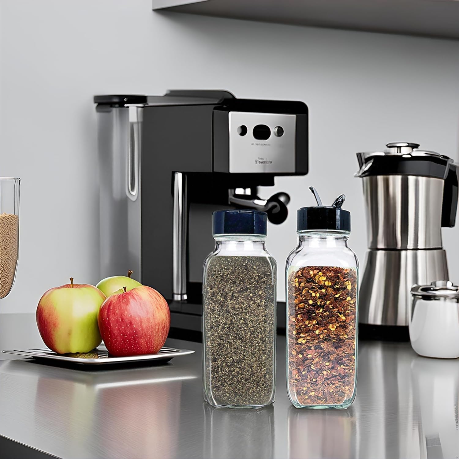 - ORGANIZATION AND STYLE: French square glass shakers with dispenser add a touch of elegance to your kitchen while keeping your spices organized. The clear glass allows you to easily see what's inside each jar.