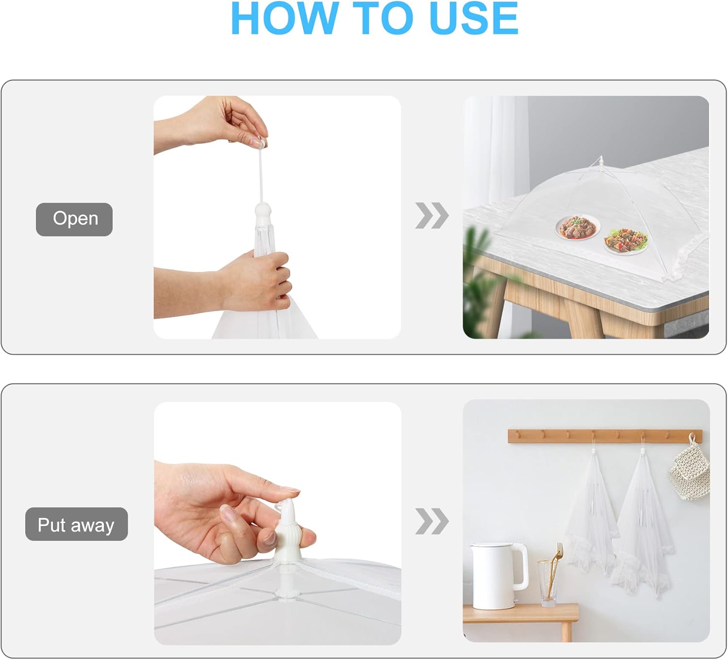 - USE ALL YEAR ROUND, EASY TO STORE: The large food covers for outside is a very ingenious umbrella design, which is very easy to pop up and fold for easy storage, preventing curious cats and children from eating unprepared dishes, and making everything more relaxed and pleasant. Suitable for birthday parties, swimming pool parties, barbecue cooking, camping picnics or DIY outdoor party supplies.