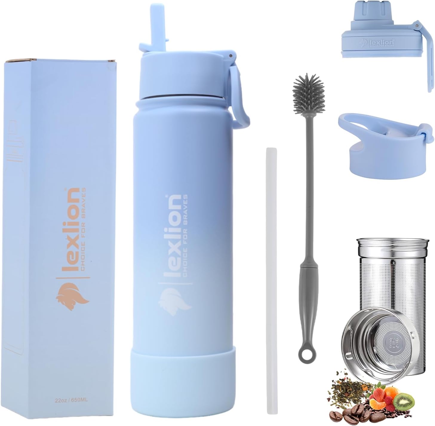 - ✅ 3 LIDS & INFUSER/STRAINER- Lexlion Water bottle comes with 3 LIDS! A spout lid, a flip lid and a Stainless steel lid (plastic inside and steel outside), 100% leak-proof and diswasher safe. Lexlion includes a newly designed 2 piece strainer stainless steel, very convenient filter to make loose tea leaves, cold coffee brew, herbs or fruit infused water. Add them to the filter basket, close the basket, and clip in the bottle with water. If infuser not needed, just remove it from the bottle