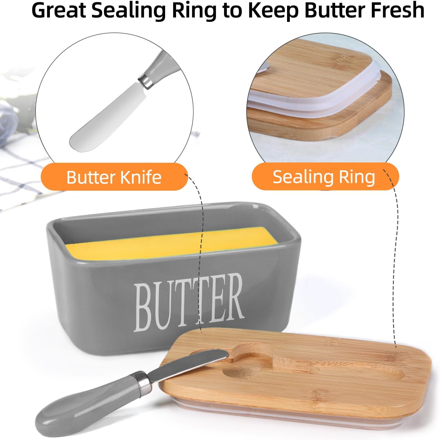 - Bamboo Lid with Sealing Ring - Made of great bamboo material and sealing ring, the butter dish cover can prevent butters from taking on refrigerator odors or losing freshness. The wooden lid doubles as a small cutting board, so you can cut and even serve patties of butter without dirtying another cutting board or dish