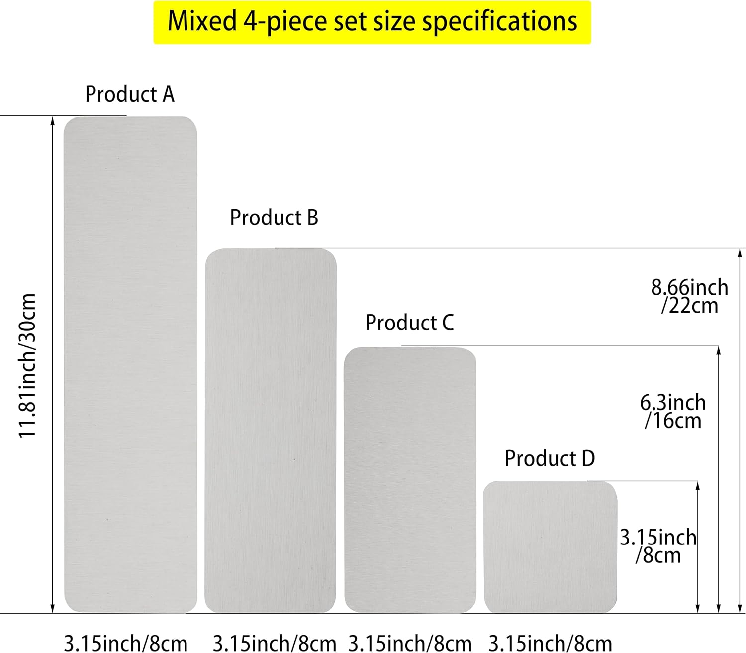 - Color : 1 Pcs 3.15" X 3.15" + 1 Pcs 3.15" X 6.3" + 1 Pcs 3.15" X 8.7" + 1 Pcs 3.15" X 11.8" White 1 Pcs 3.15" X 3.15" + 1 Pcs 3.15" X 6.3" + 1 Pcs 3.15" X 8.7" + 1 Pcs 3.15" X 11.8" White