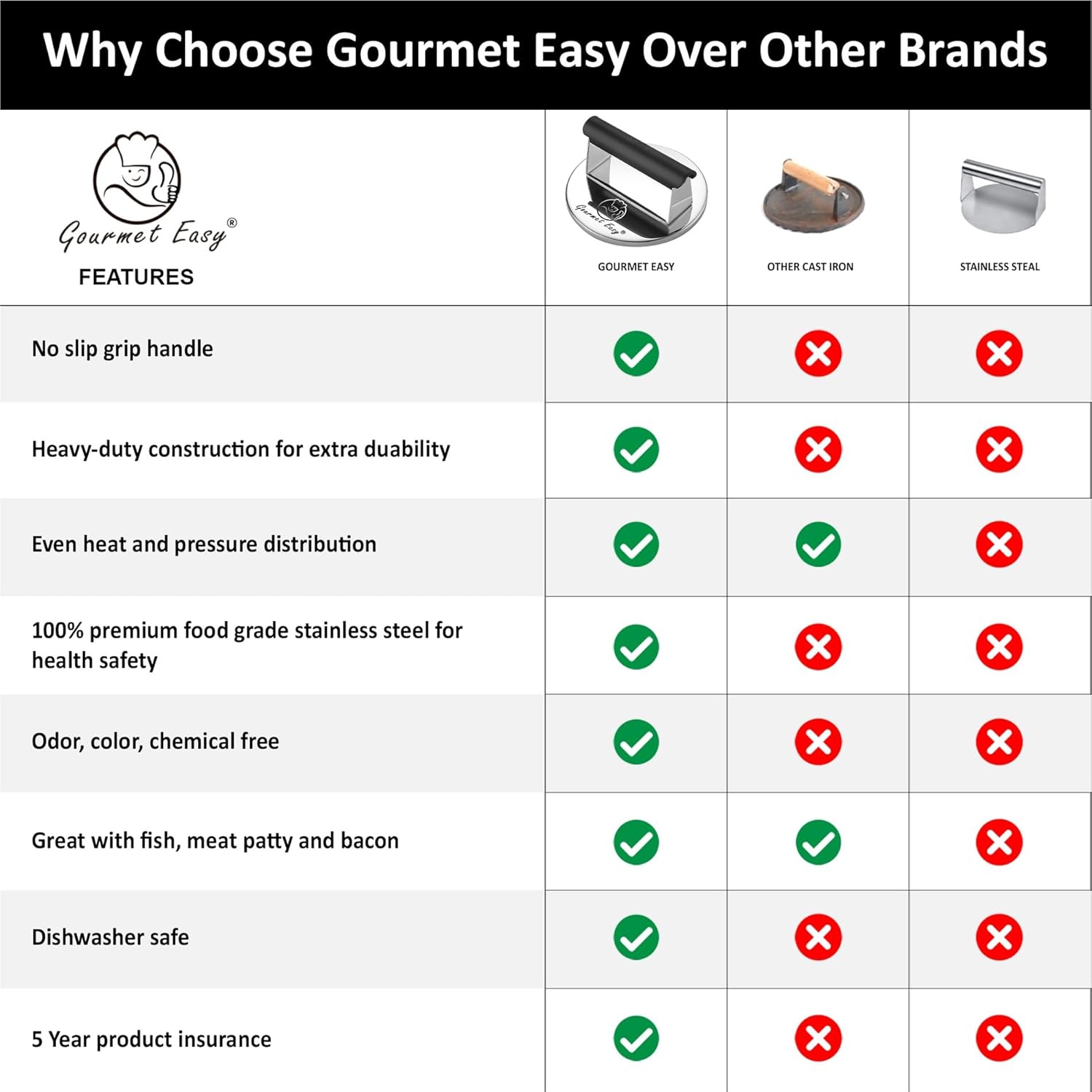 - SMOOTH & FLAT SURFACE: Gourmet Easy smashburger press with non-stick flat surface ensures easy release of meats, and also helps you for easy cleaning. A durable heavy duty stainless steel burger press for griddle will give you perfectly shaped burgers in no time!