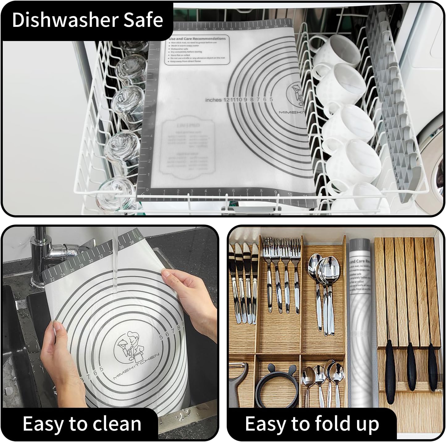 - 【Easy to Clean & Store】:Even burnt sugar and fat falls off on its on, you can dump the crumbs in the trash in a snap, No more scrubbing, Just rinse the mat in warm soapy water to clean it or air drying will be enough. You just roll it up and hold it in place with the band and pop it in the cupboard, So easy and space saving storage. Our dough mat is also microwave and freezer safe.