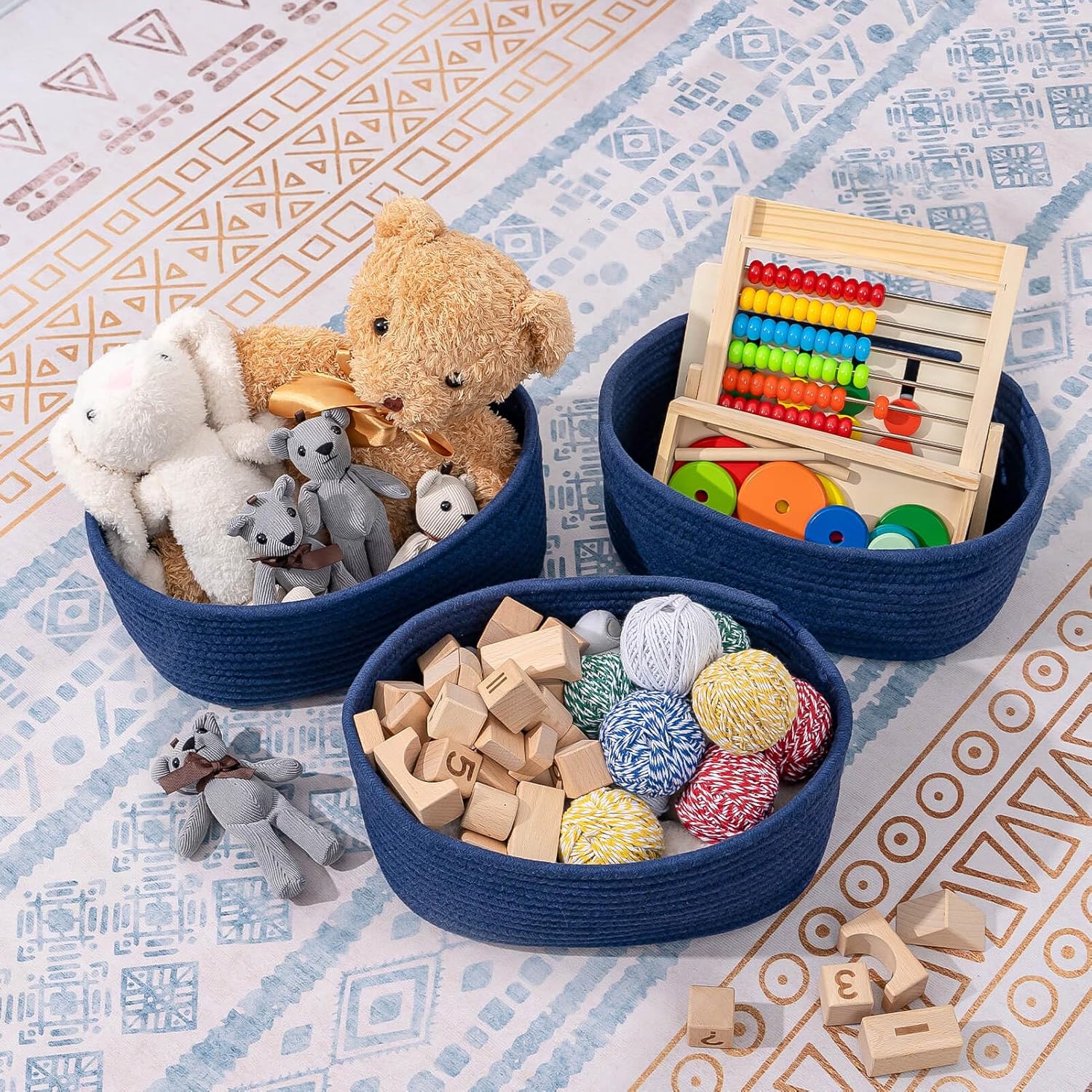 - Classy Natural Cotton Rope Storage Baskets-High quality well made. Very sturdy and a cute modern style. Durable woven rope, Long-lasting, skin-friendly, soft and attractive. You need these adorable baskets to put some supplies in, diaper, jewelry, cosmetics, makeup brushes, tea bags, storing smaller toys, toddler socks, candy