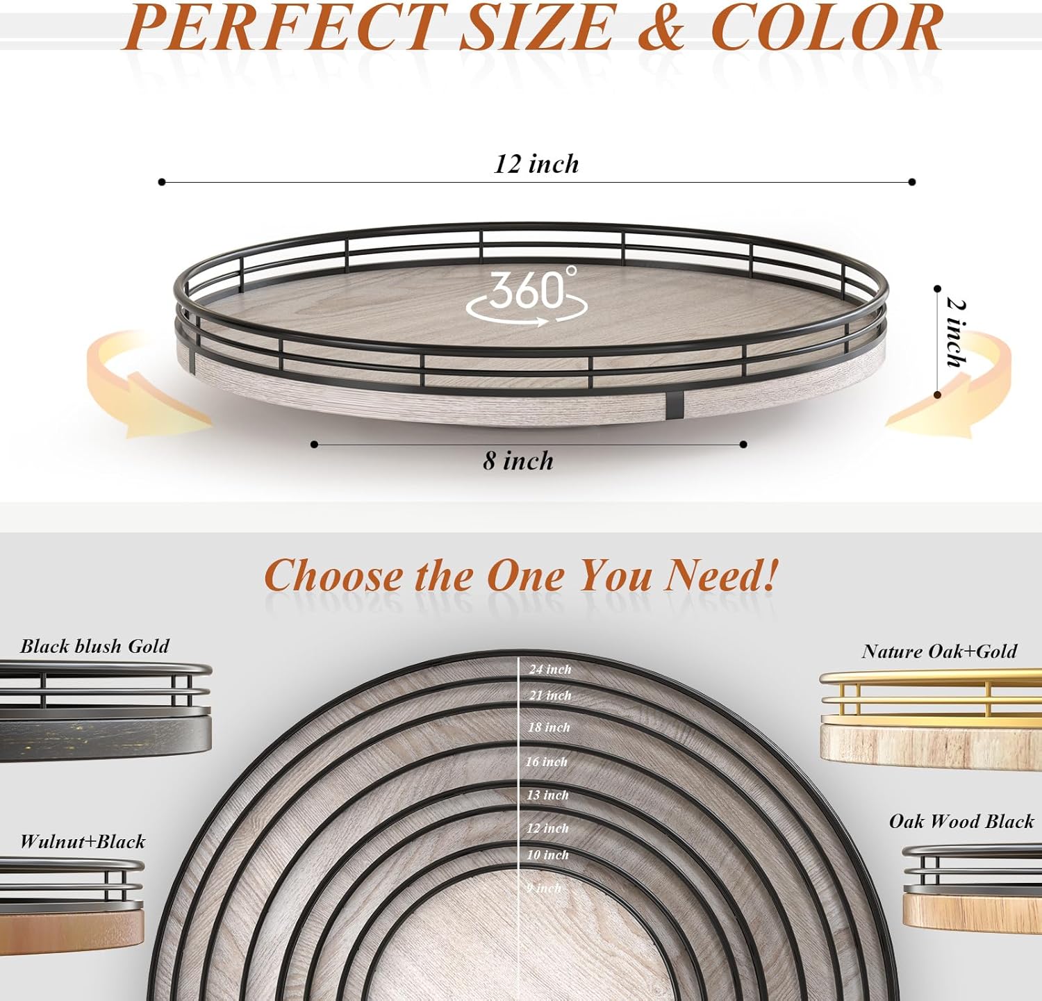 12" Farmhouse Lazy Susan for Kitchen & Coffee Table Decor β Rustic Wood Tray with Black Metal Frame, Decorative Centerpiece for Dining Room, Ottoman, Living Room, Serving or Vanity Use
