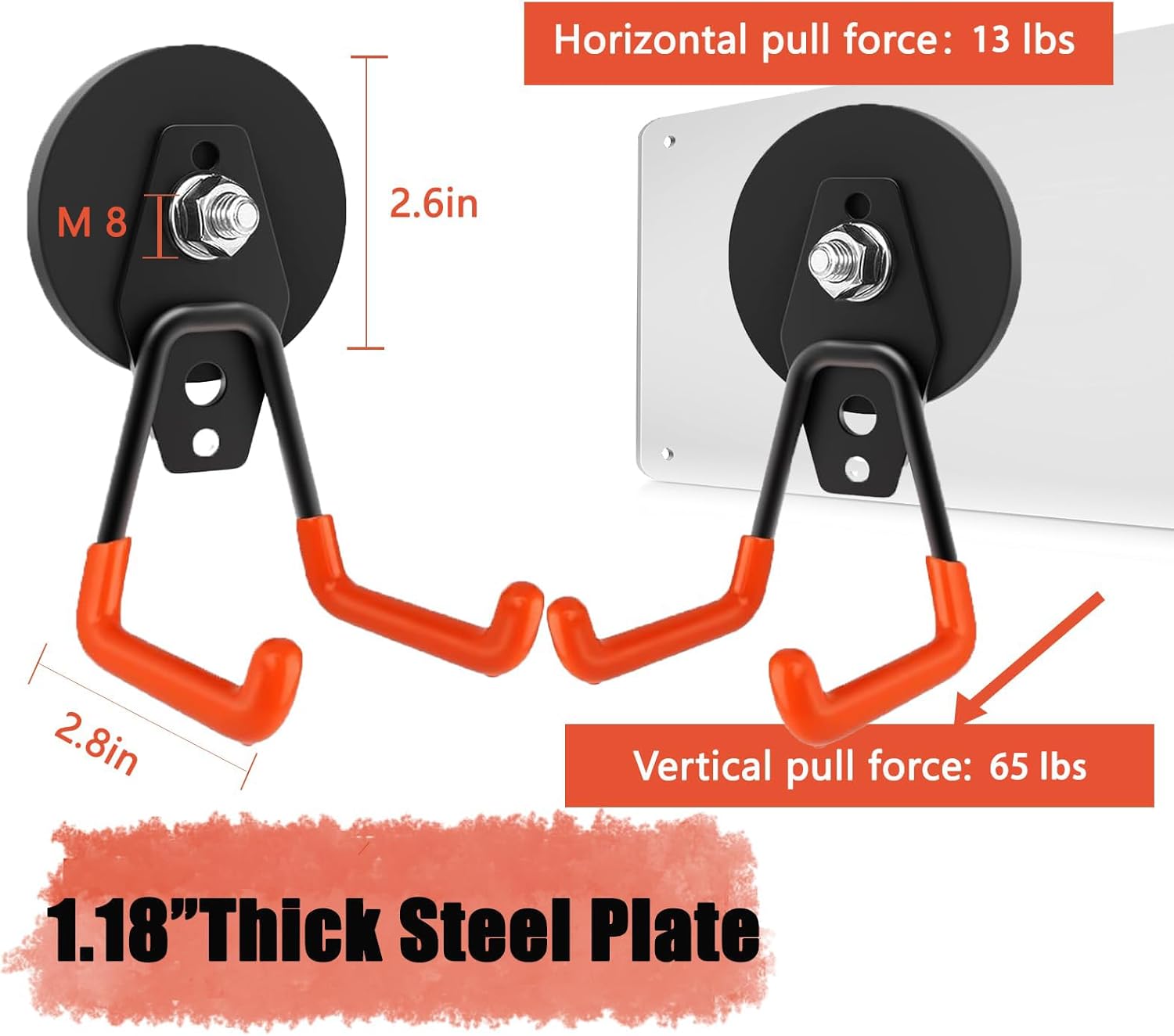 - 🧲[Heavy Duty Magnetic Hooks]: Each 2.6inch magnet base is equipped with 6pcs of super strong rare earth magnets inside. The magnet base vertical pull force is 65lbs and horizontal pull force is 11lbs.The weaker magneic hook from some other brand is only 8lbs instead of 40lbs or 45lbs they claimed.