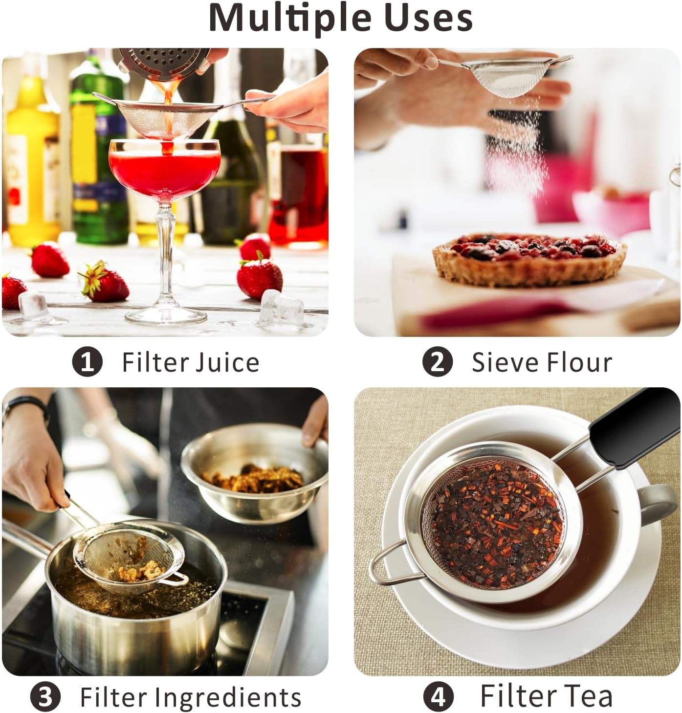 - HANDLE ALL YOUR TASKS-4" strainer perfect for tea, quinoa, powdered sugar or juice, and 7.8" strainer, perfect for pasta, which are the most popular and preferred sizes needed to handle all your straining, sieving, sifting, filtering and rinsing tasks. Nest the strainers together for space saving storage or hang them together within reach of where you use them the most.