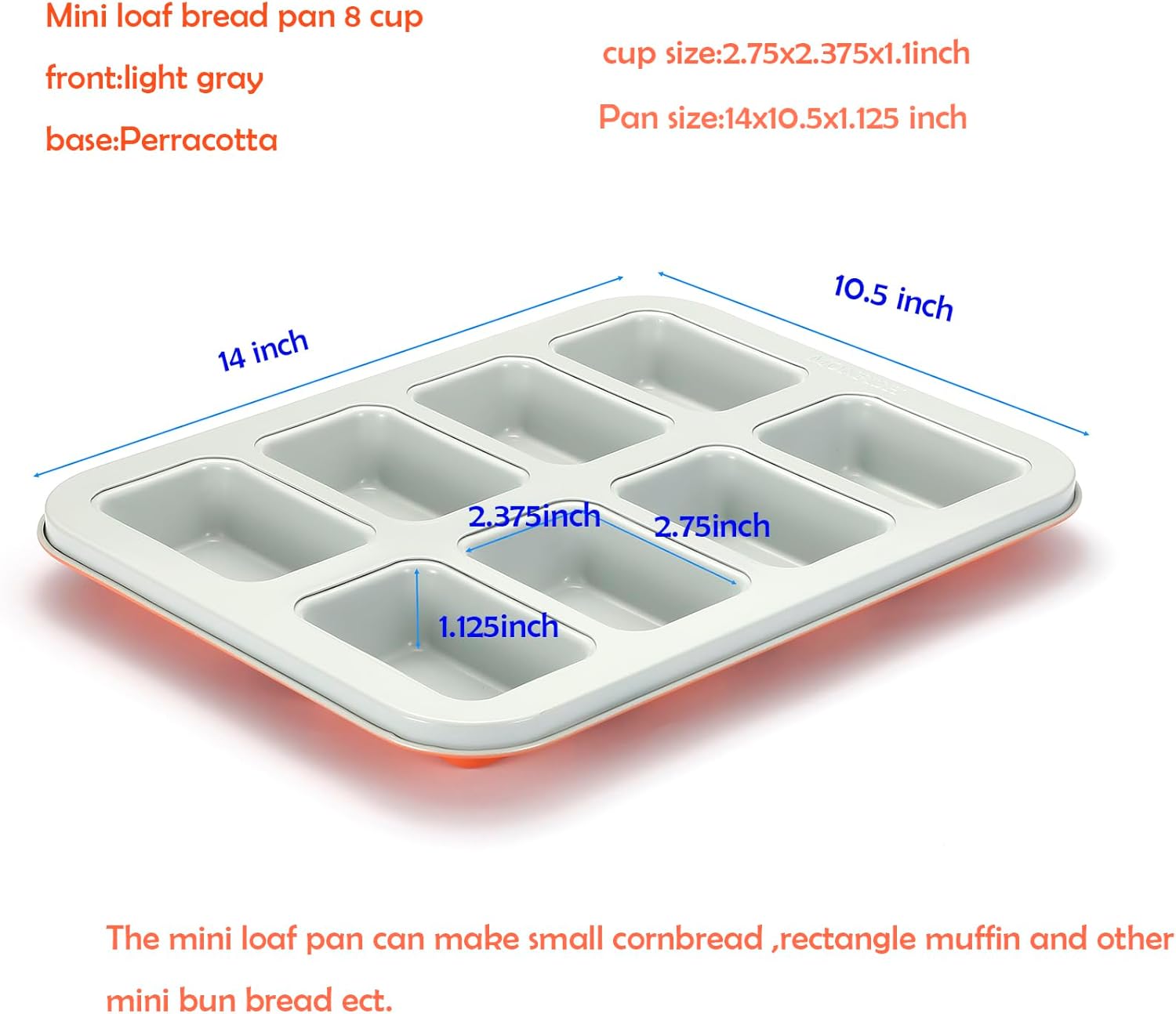 - SPECIAL COLOR DESIGN - Our 8 cavity mini loaf pans come with a light gray smooth non-stick coating so you can easily release your treats when they're done baking. And the bottom of the mini loaf bread baking pan is perracotta. The colorful design of the rectangle small cake tray can add more delight for your kitchen.