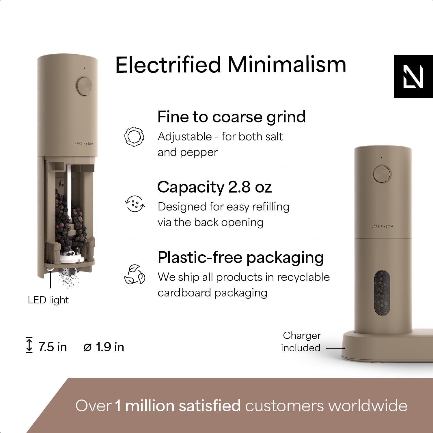 LARS NYSØM Electric Salt and Pepper Grinder Set, USB Rechargeable, Automatic Salt and Pepper Mills, Spice Shakers Refillable with LED Light, Adjustable Coarseness, Ceramic Grinder (Taupe Brown)