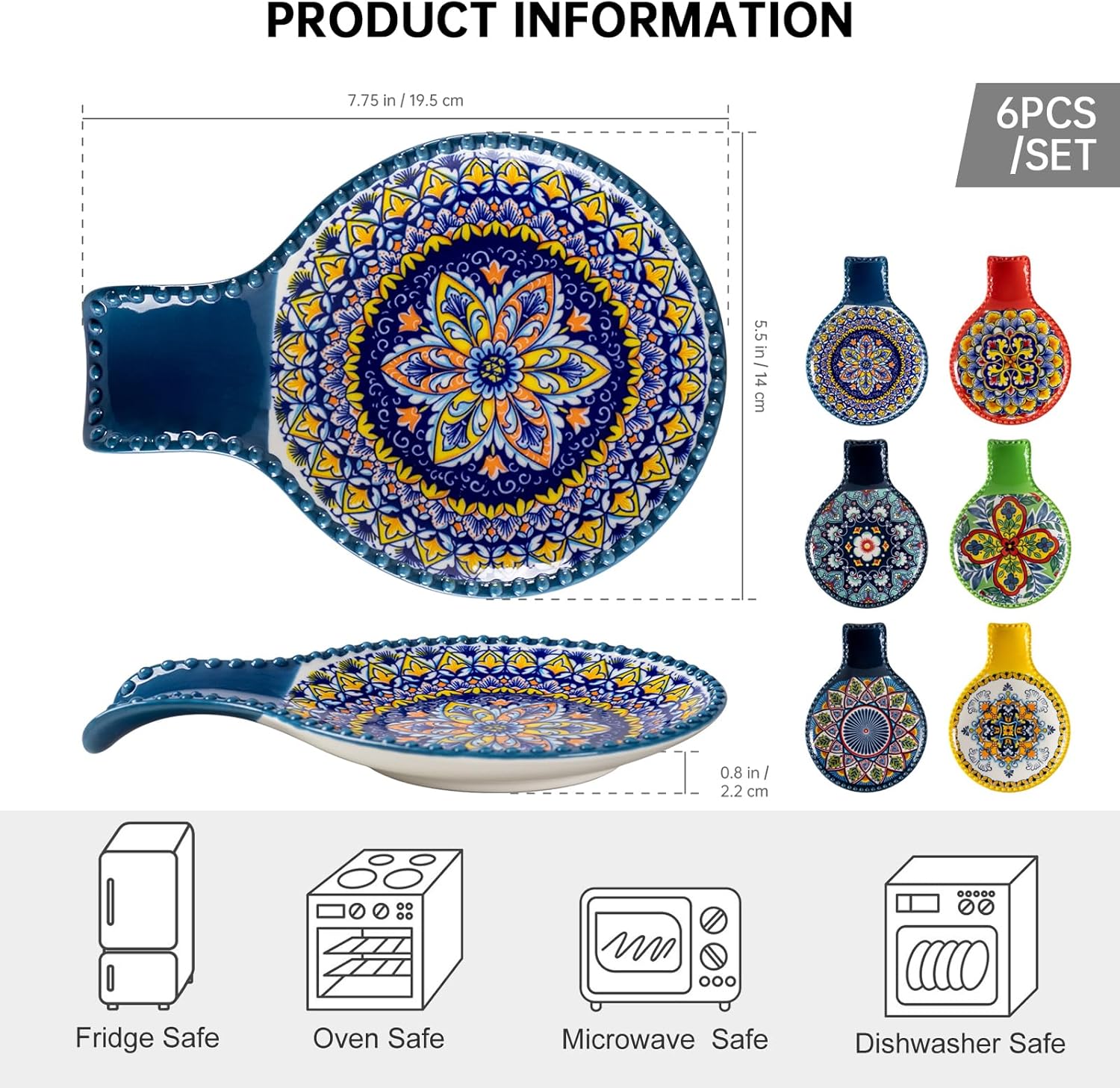 Ceramic Spoon Rest for Stove Top, Large Spoon Holder for Kitchen Counter, Cooking Utensil Rest for Ladle, Spatula, Tongs, Housewarming Gifts Set of 6 - Bohemian Style