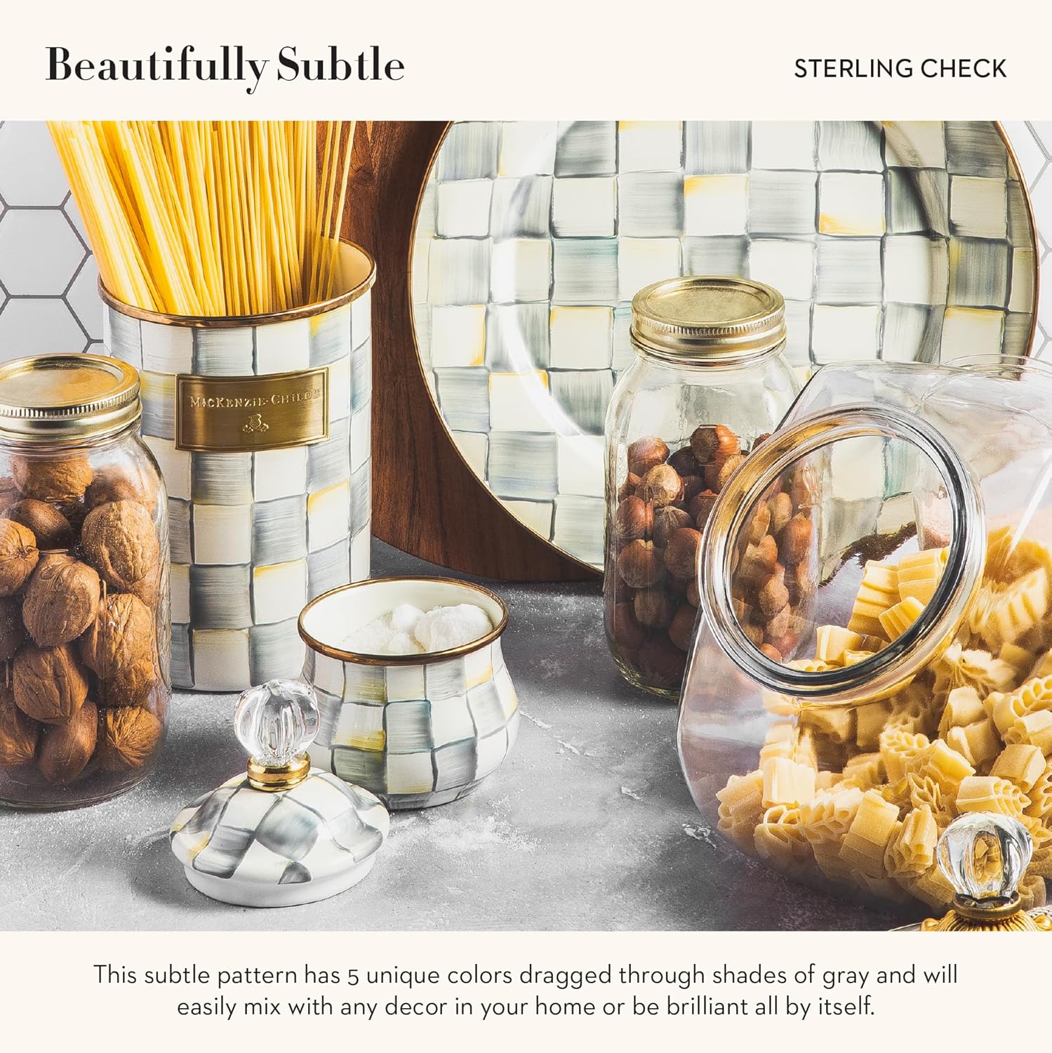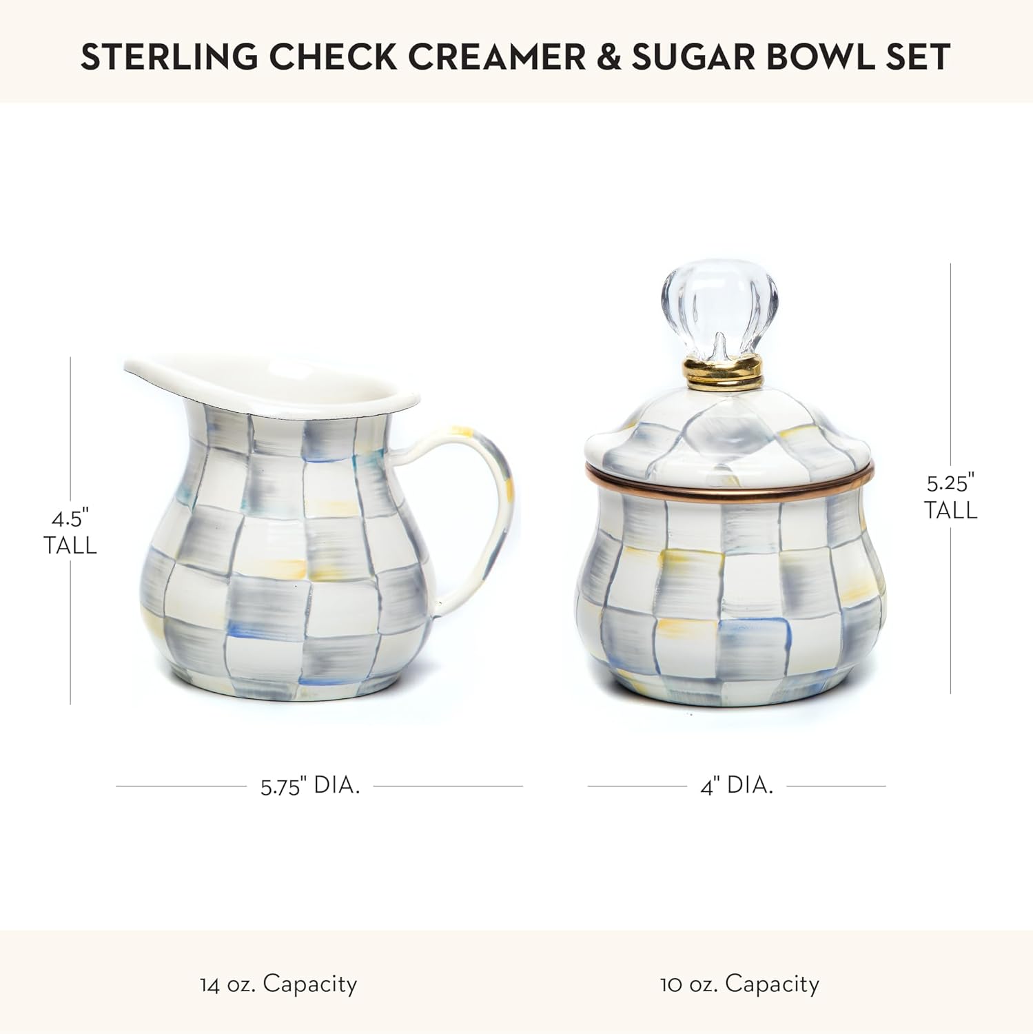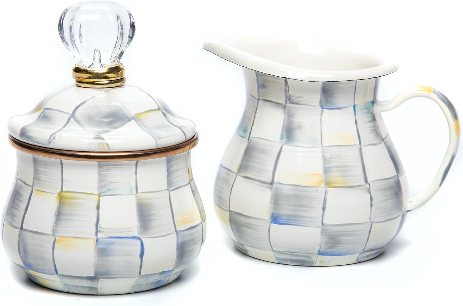 - SERVING ESSENTIALS: Dish out sugar and cream with this unique serving set. It features our Sterling Check pattern with glossy hand-painted color-dragged gray-and-white checks on enameled steel. The lid is topped with a decorative knob.