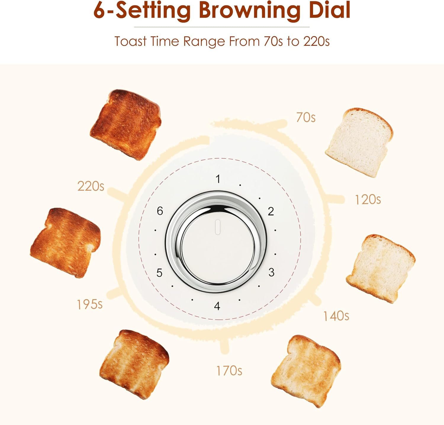- 6 Setting Shadow Knob: Roter Mond toaster has 6 different baking settings for you to choose with lower settings and higher settings from 70 seconds to 220 seconds, adjustable for everyone's taste, with time and shadow being controllable. You can complete the perfect toast and enjoy your desired tastes