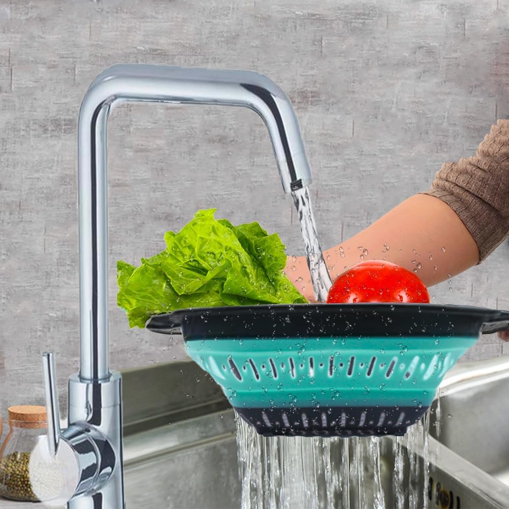 - 🍎FOLDABLE & SPACE SAVING – Ergonomic and space-saving design. The silicone folding strainers can be folded down to under 2 inch, save much space for your kitchen and convenient to store in kitchen drawer, cabinet or drying tray, even can be hung on hook. Perfect for small kitchen, camping, RV, travel trailer.
