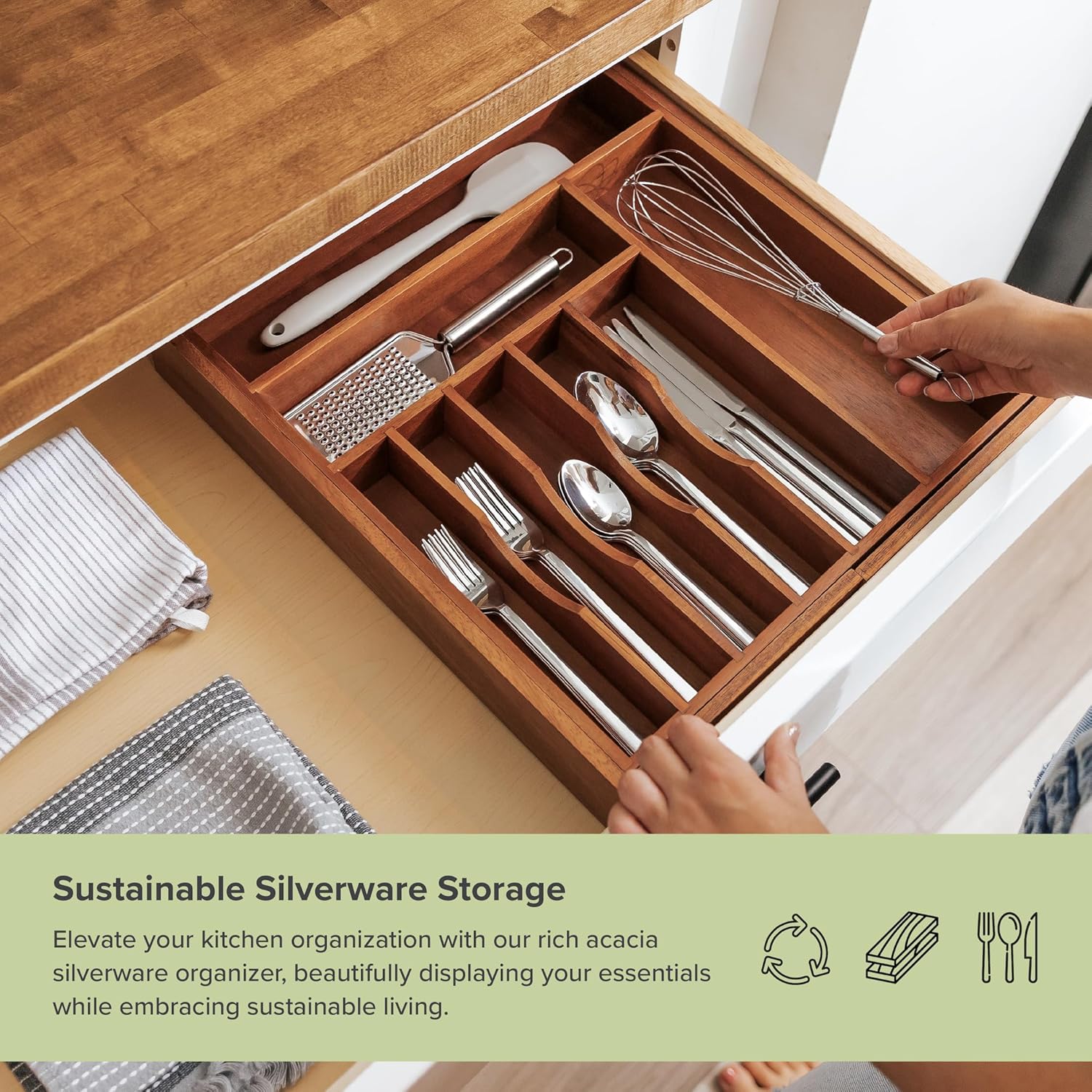 KitchenEdge Premium Silverware, Flatware and Utensil Organizer for Kitchen Drawers, Food-Safe Contract Grade, Expandable from 16 to 28 In, Natural Acacia