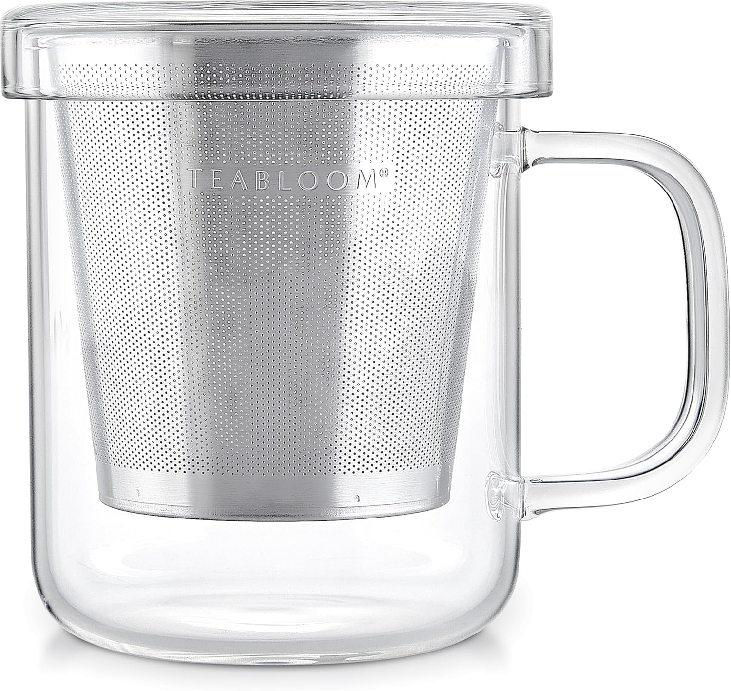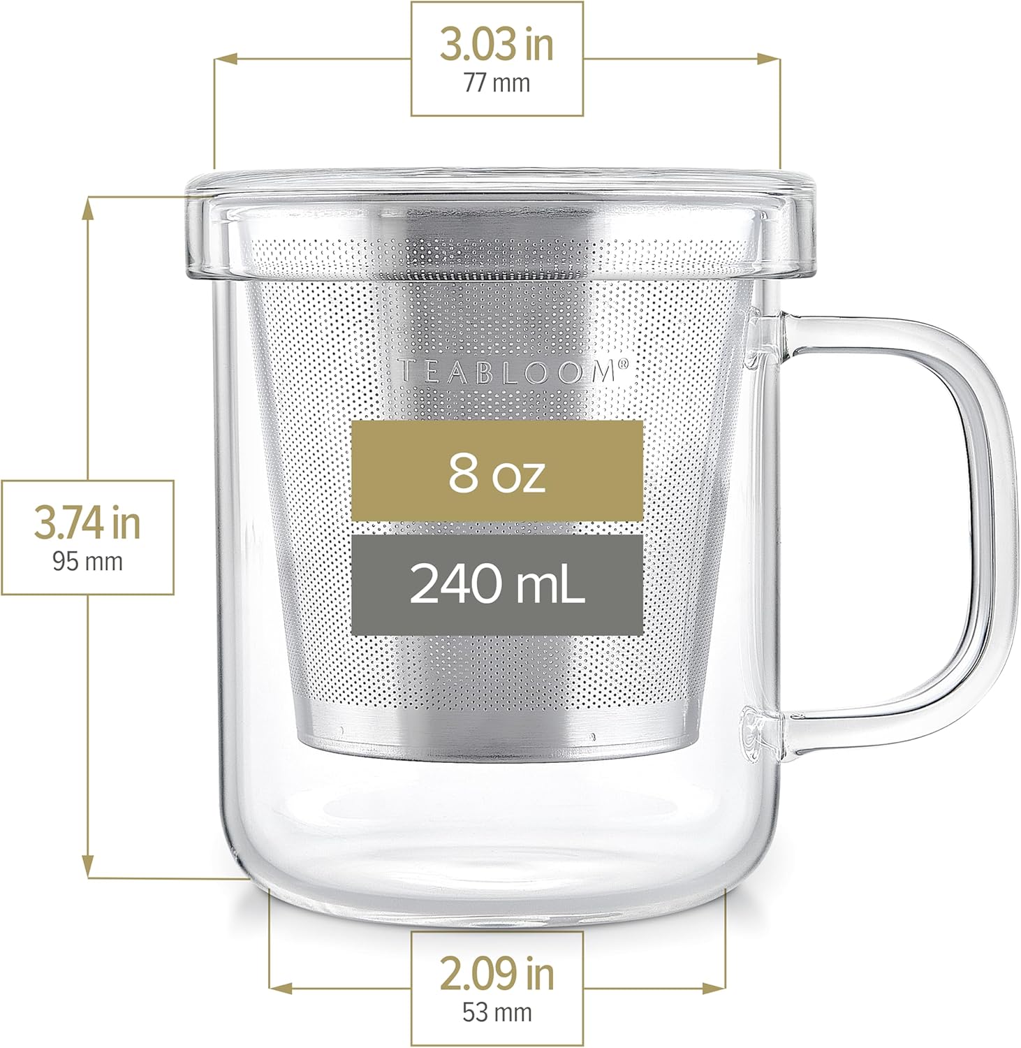 Teabloom Premium Borosilicate Glass Mug with Stainless Steel Loose Leaf Tea Infuser and Lid/Dish - 8 Ounces (240 mL)